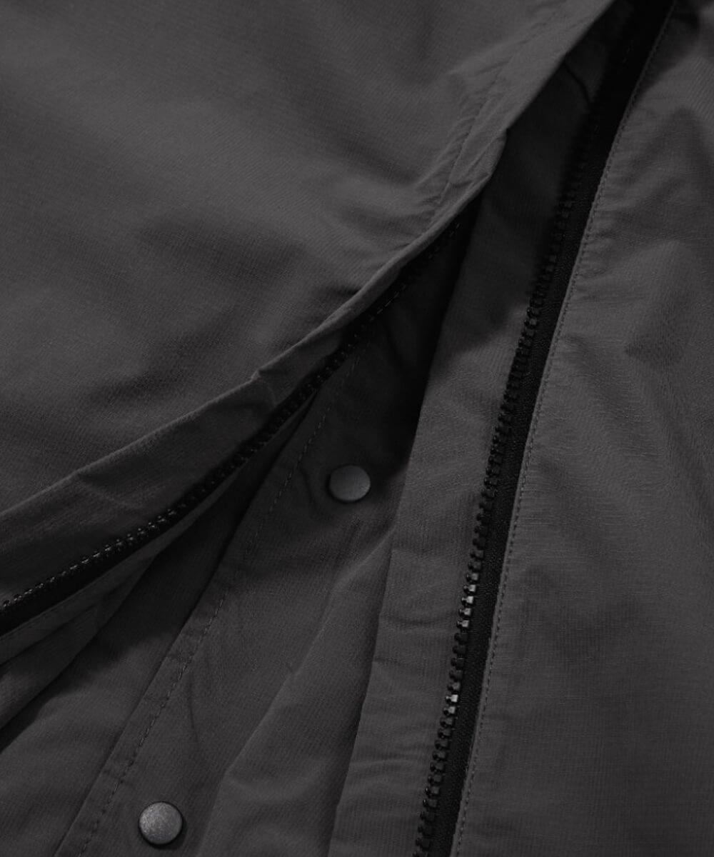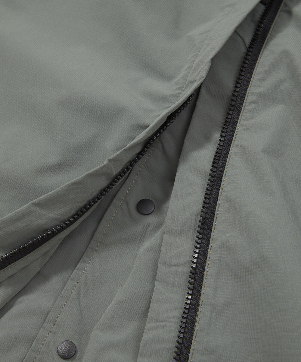 前開きはスナップボタン仕様。フロント下部には立体ポケットを配置。