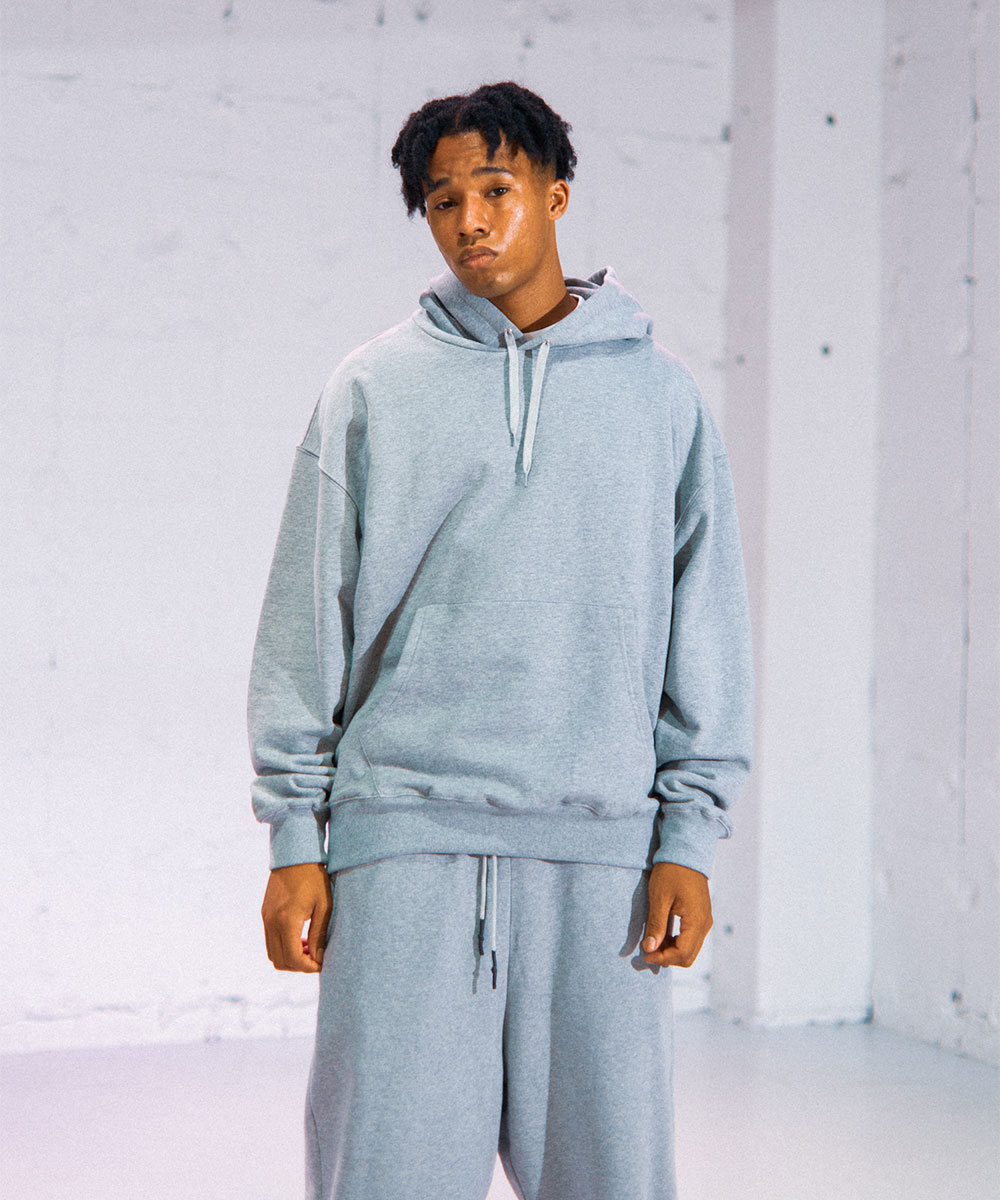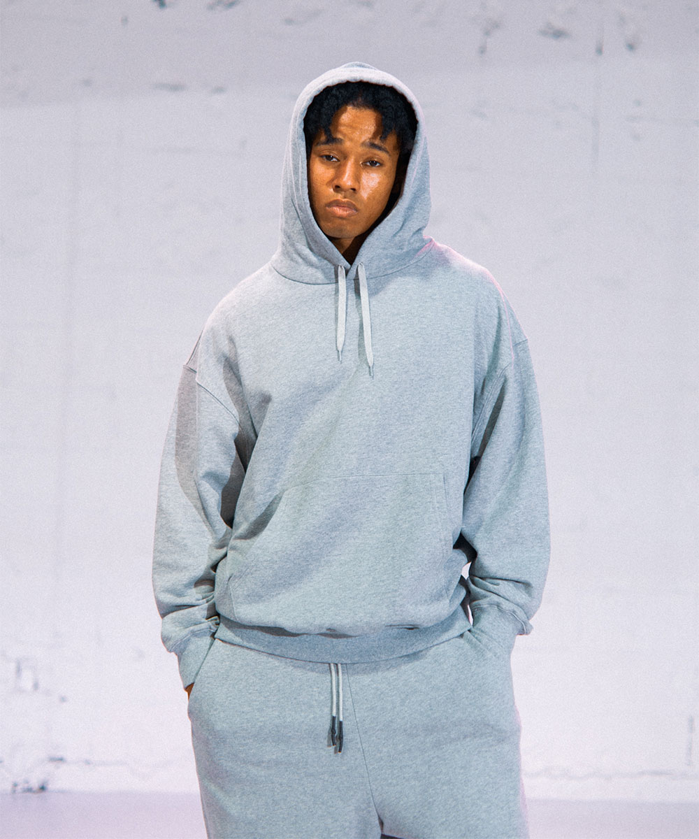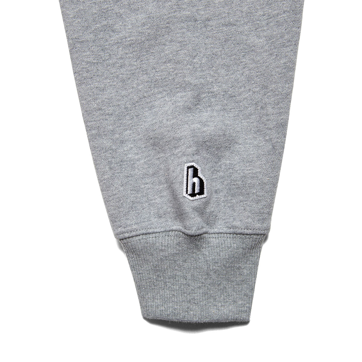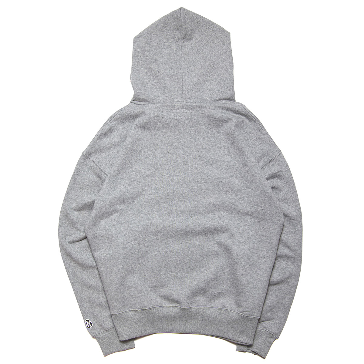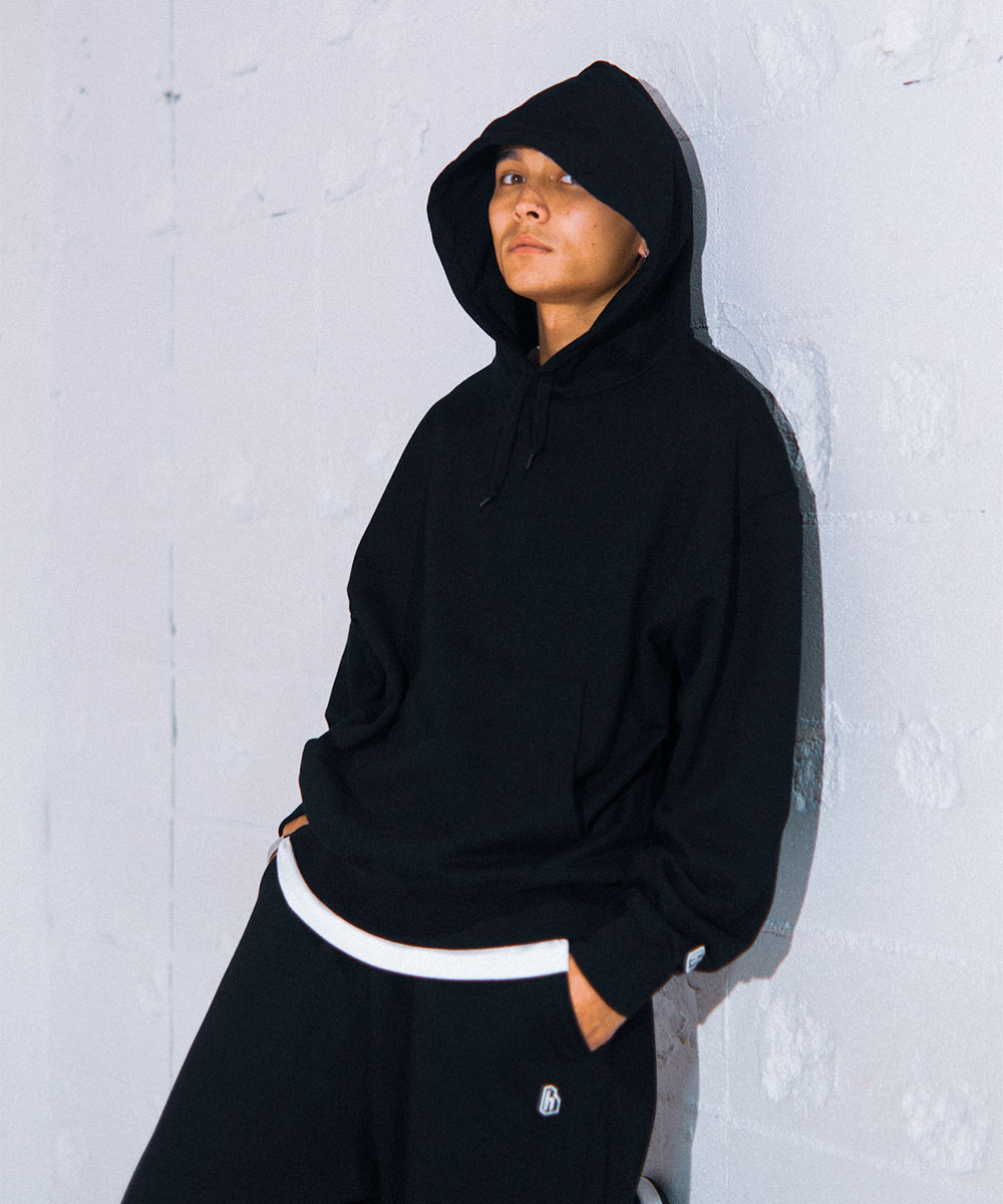 左袖の"h"ロゴワッペンのみのシンプルなスウェットフーディー。