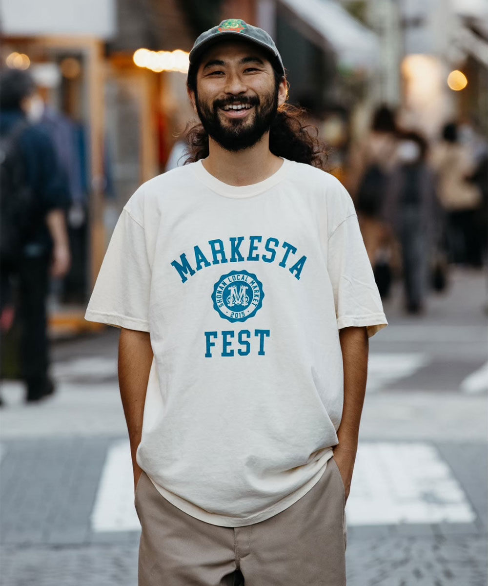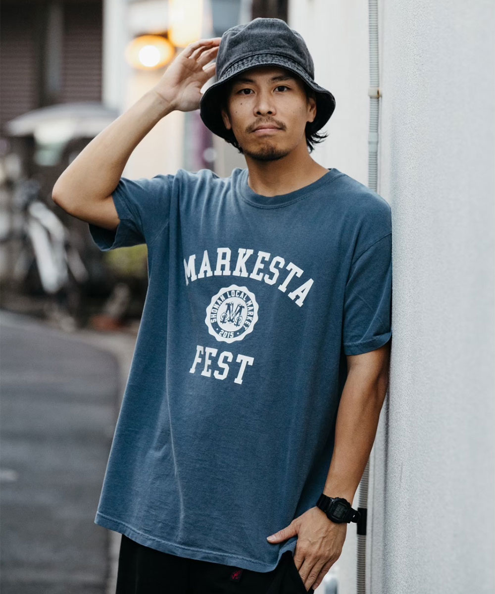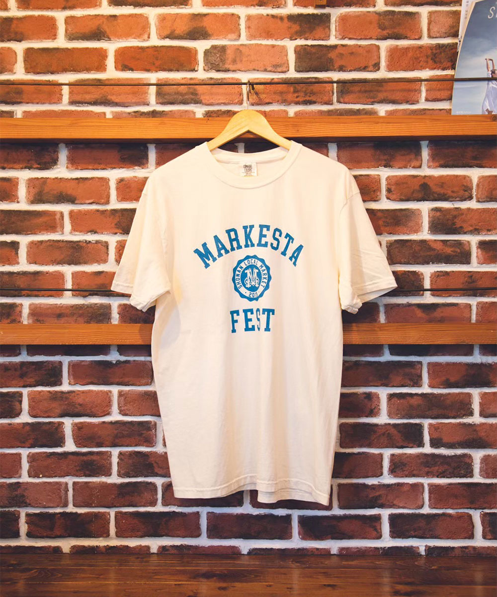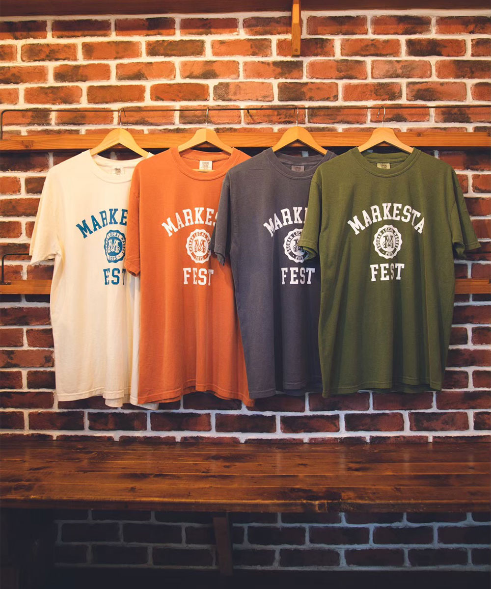 クラシックなカレッジロゴをモチーフに、フェスティバルの賑わいとストリートカルチャーの要素をミックスしたMARKESTAオリジナルTシャツ。