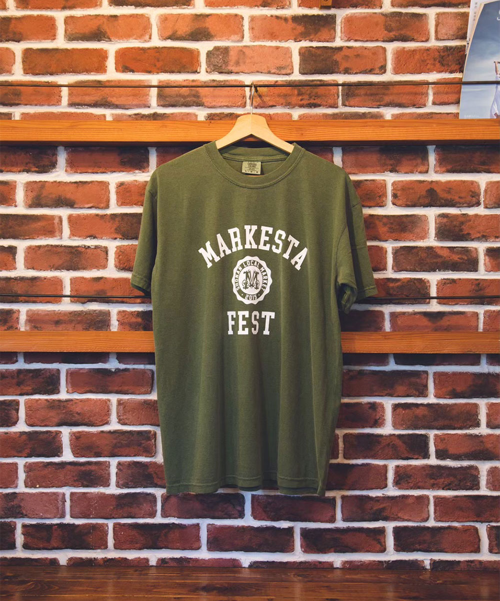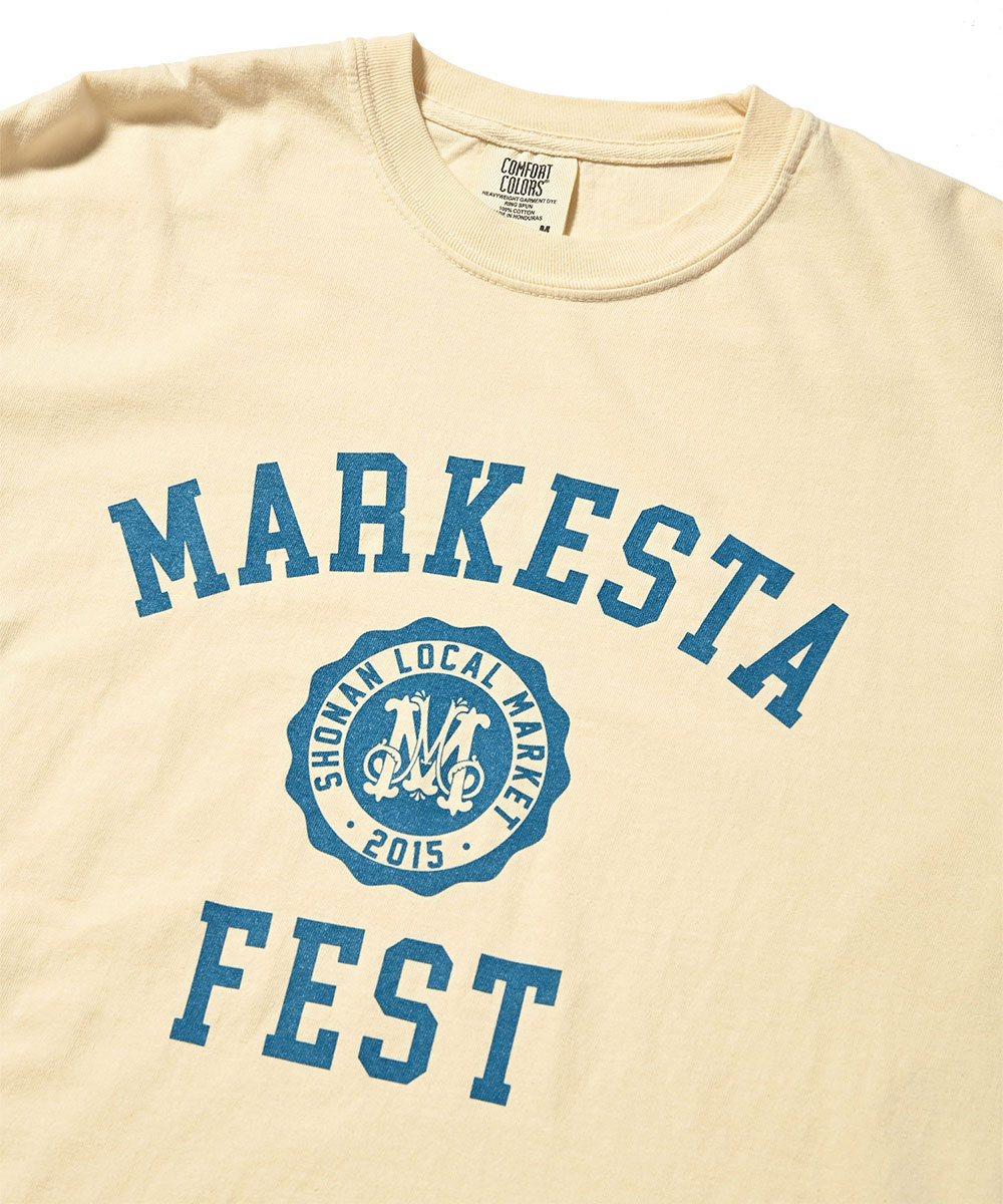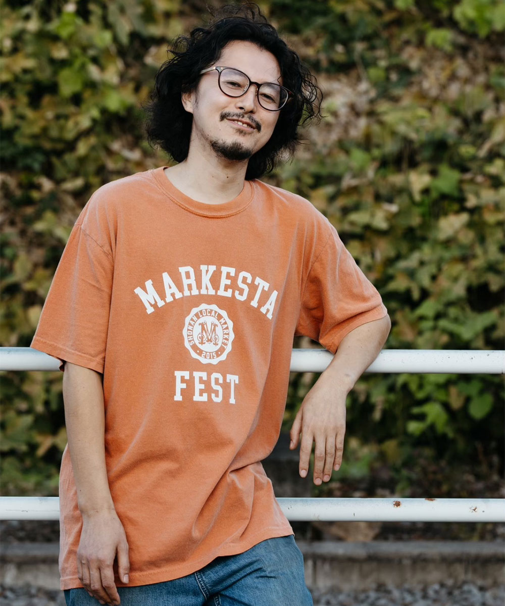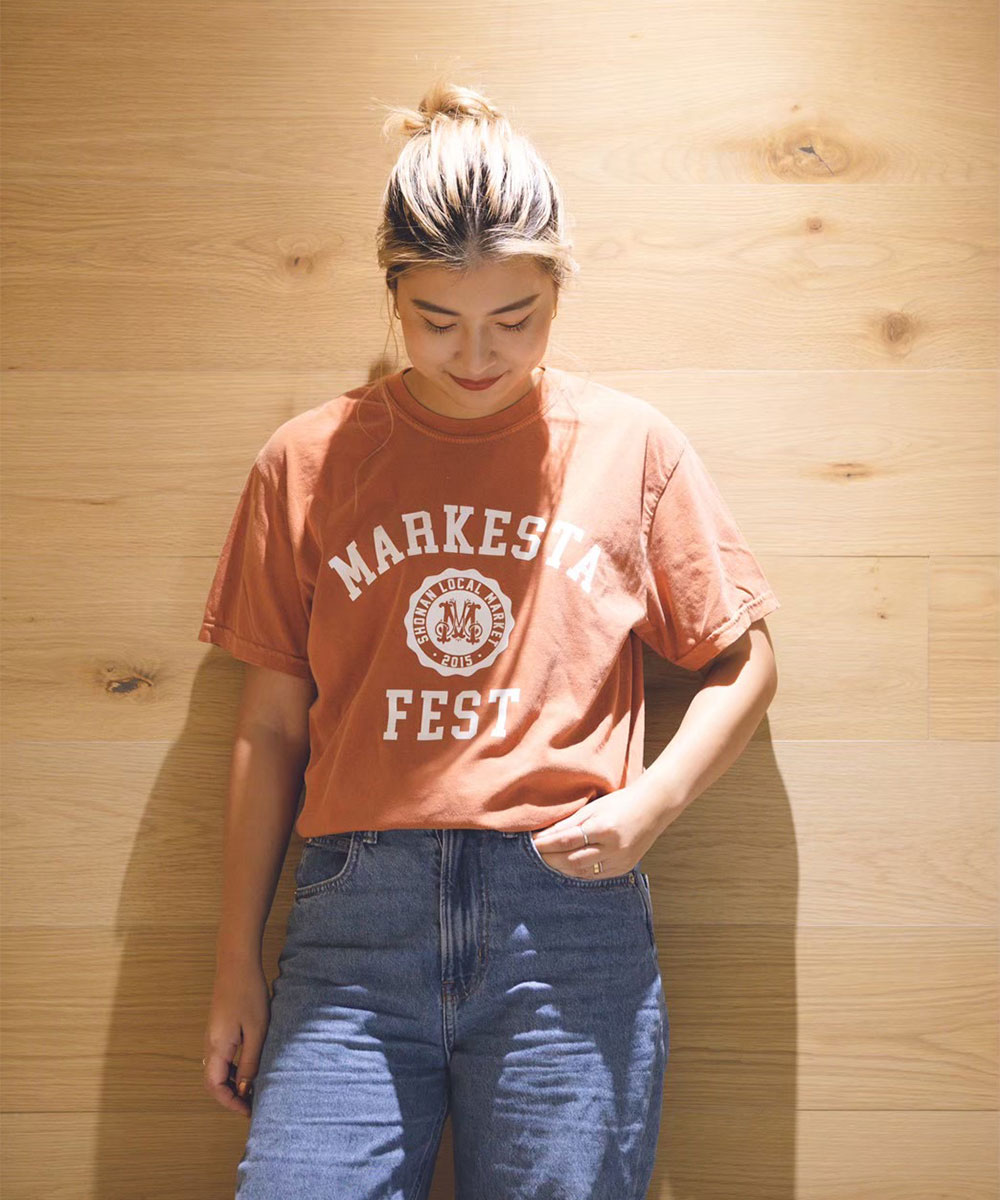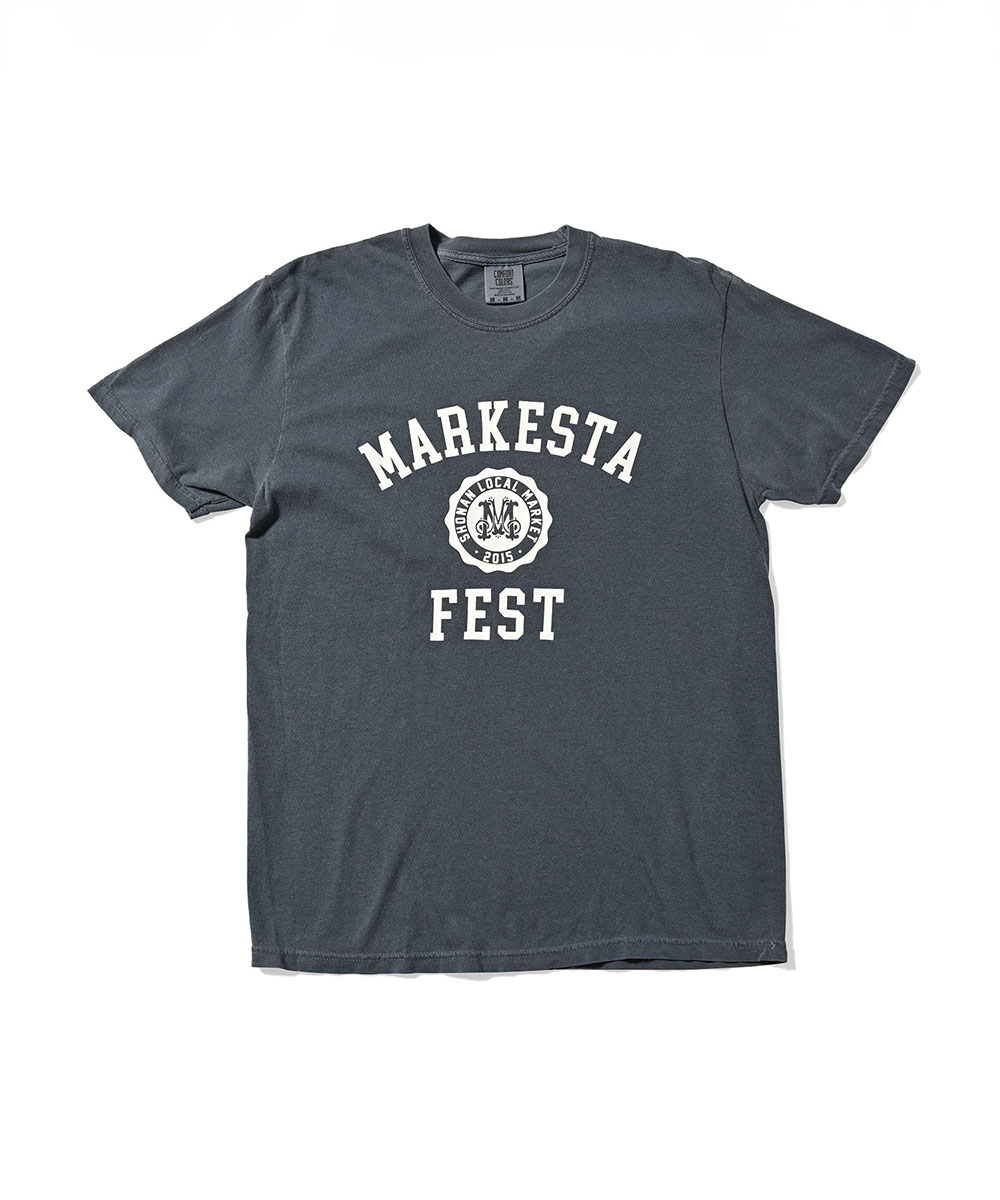 クラシックなカレッジロゴをモチーフに、フェスティバルの賑わいとストリートカルチャーの要素をミックスしたMARKESTAオリジナルTシャツ。