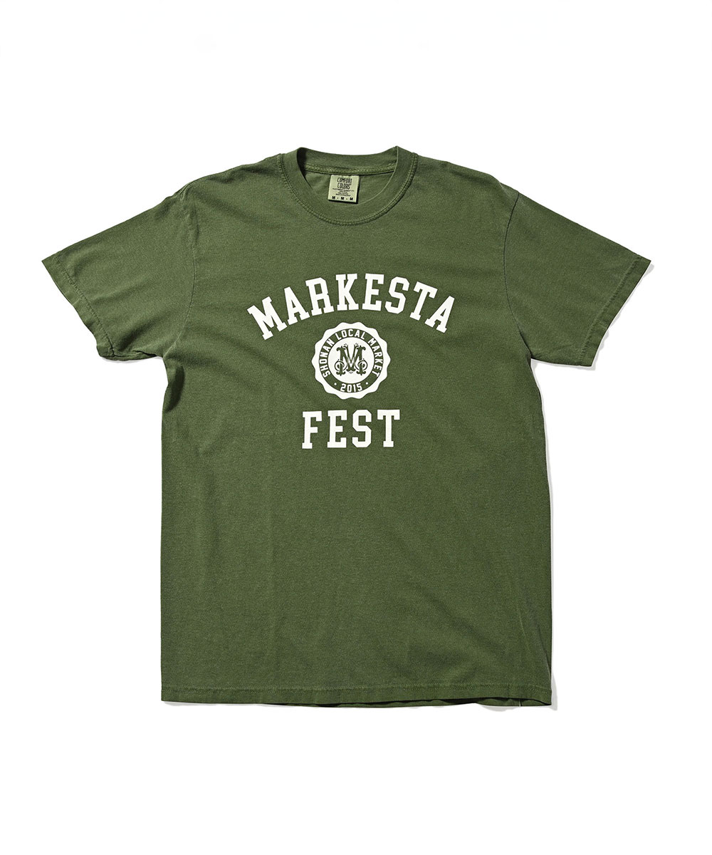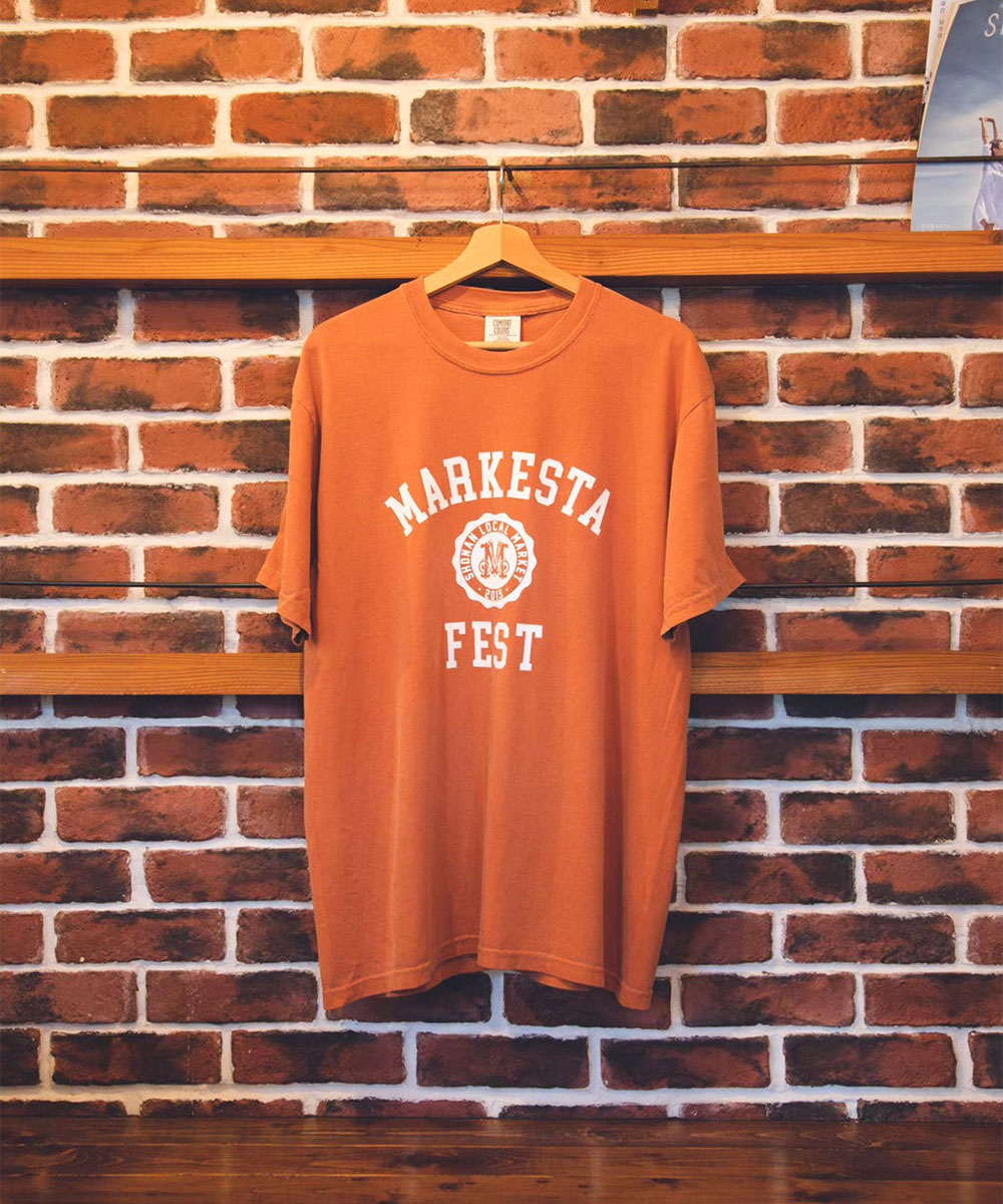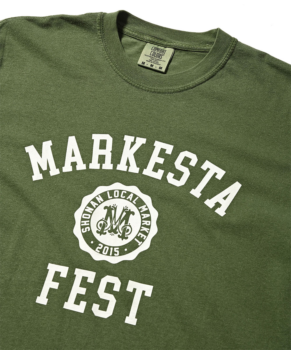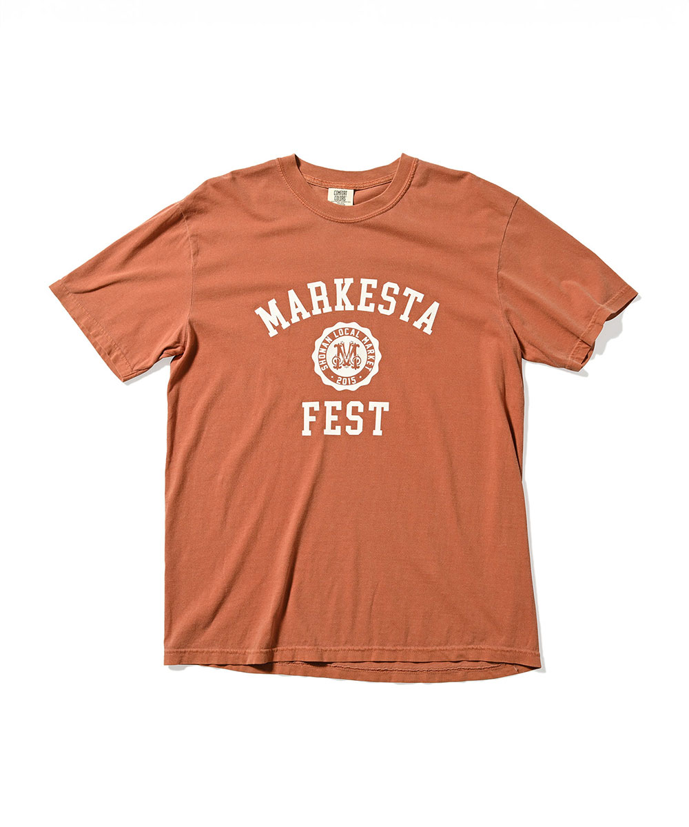 クラシックなカレッジロゴをモチーフに、フェスティバルの賑わいとストリートカルチャーの要素をミックスしたMARKESTAオリジナルTシャツ。