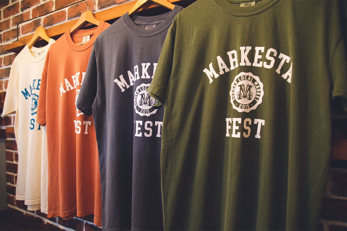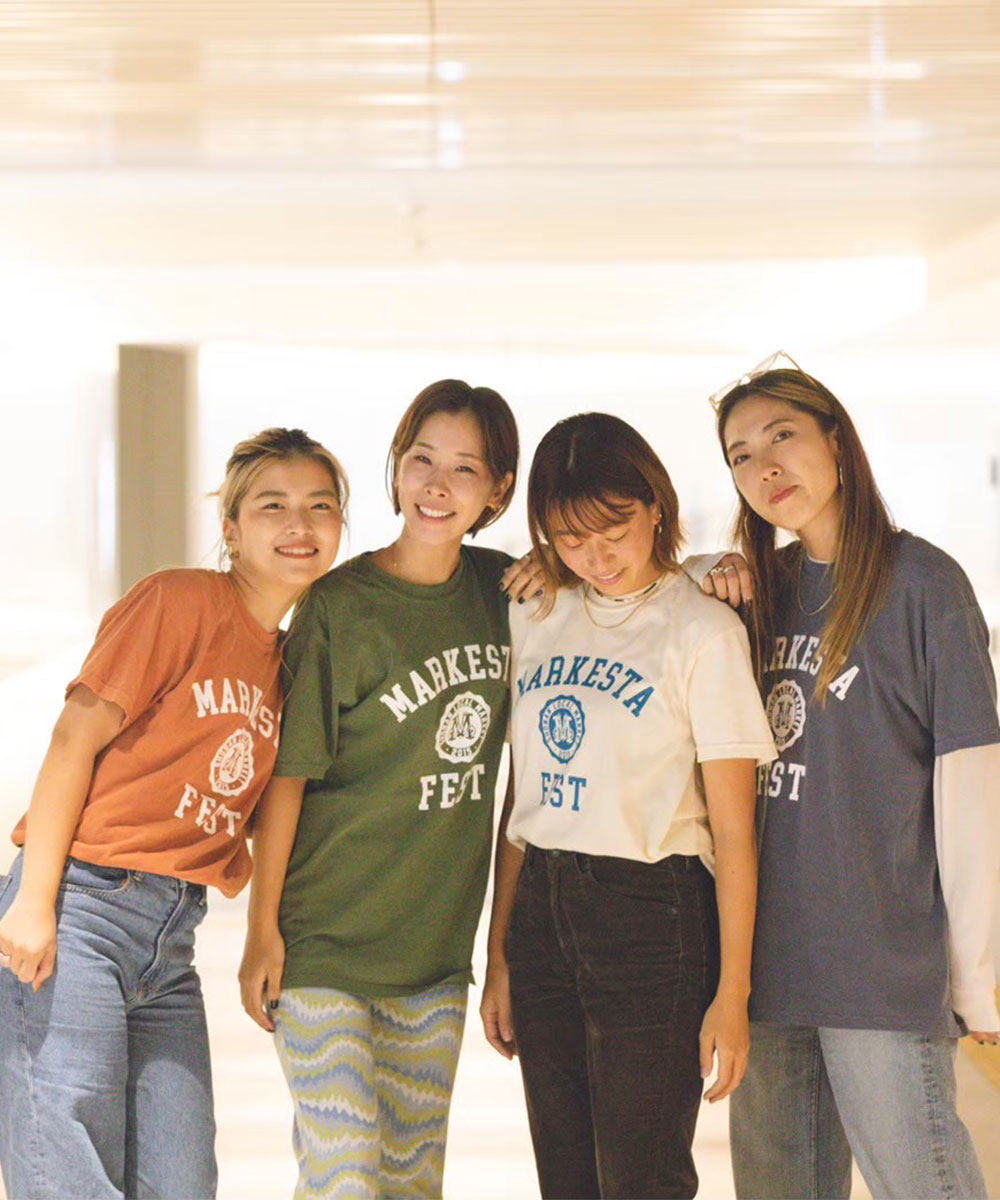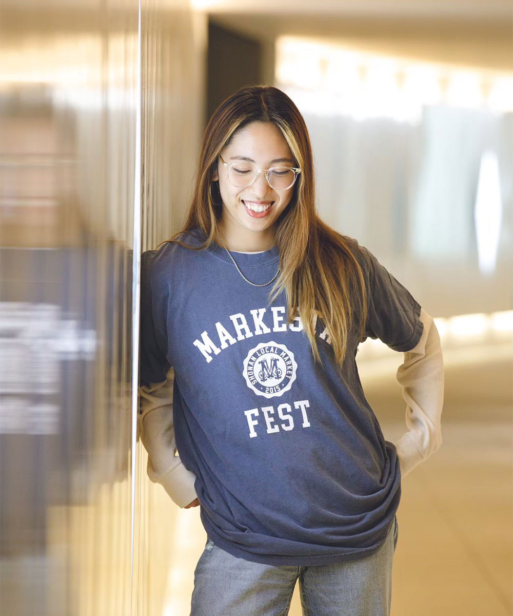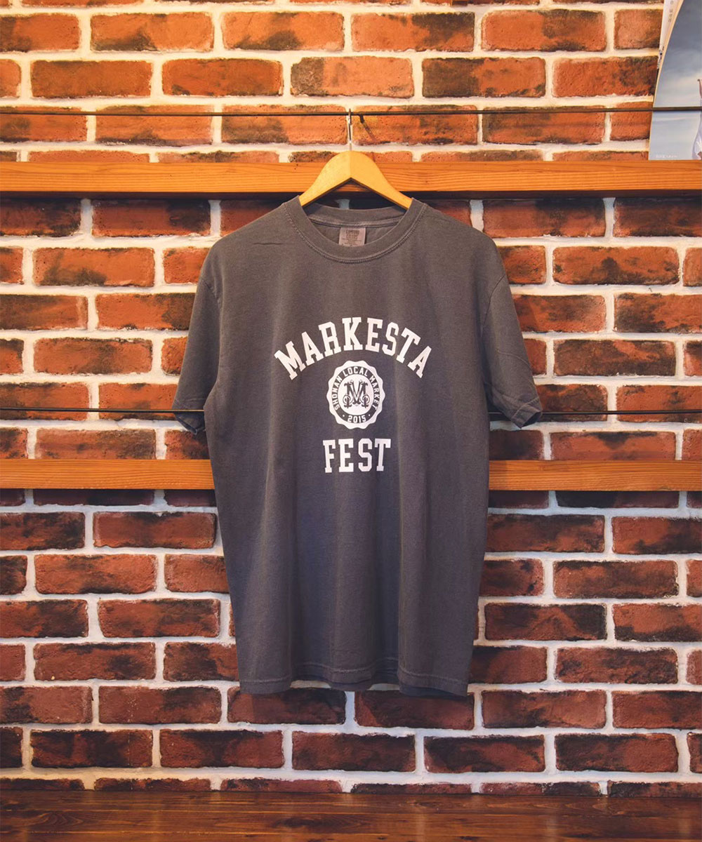 クラシックなカレッジロゴをモチーフに、フェスティバルの賑わいとストリートカルチャーの要素をミックスしたMARKESTAオリジナルTシャツ。