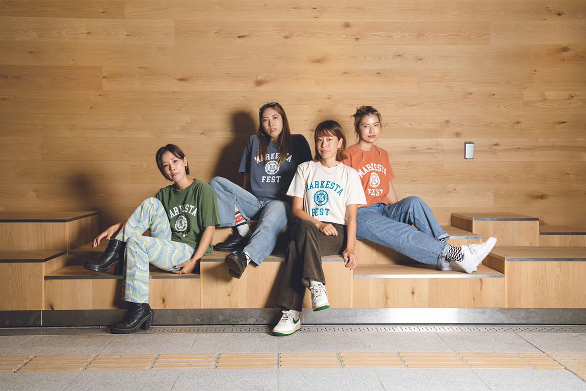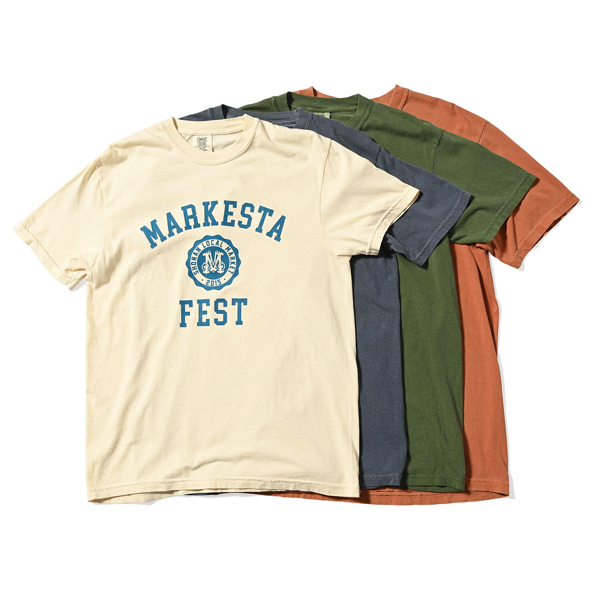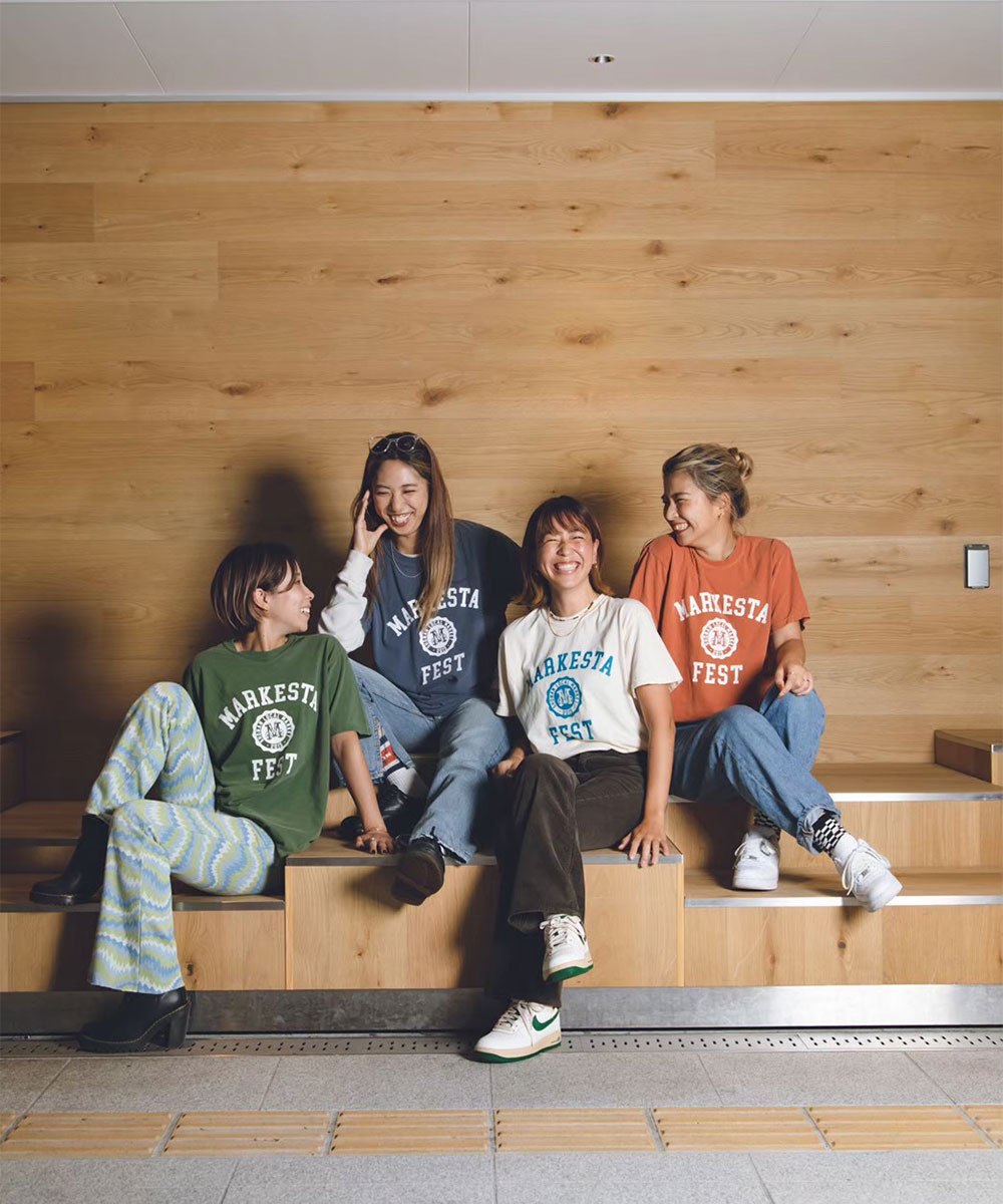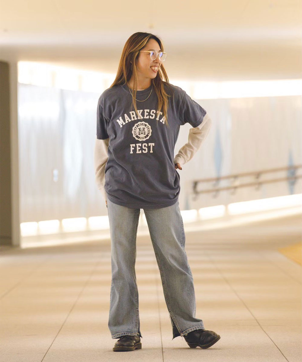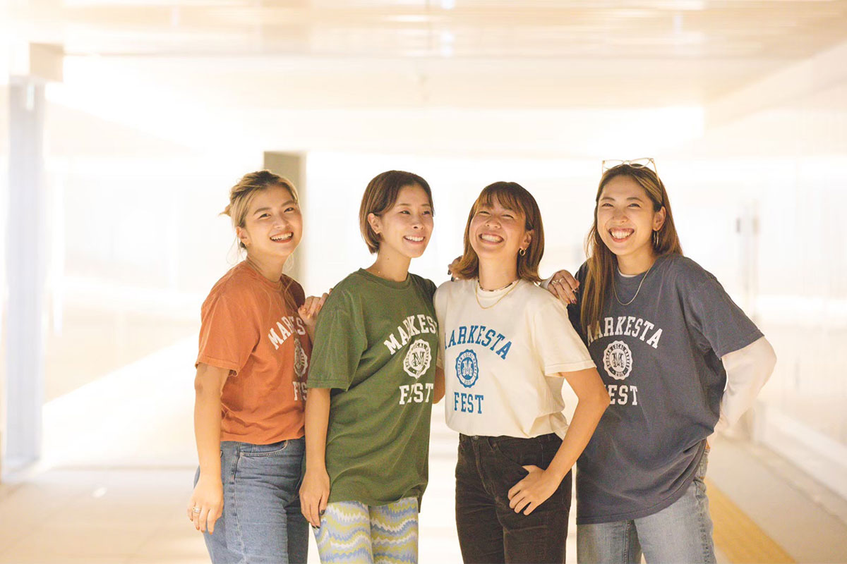 クラシックなカレッジロゴをモチーフに、フェスティバルの賑わいとストリートカルチャーの要素をミックスしたMARKESTAオリジナルTシャツ。