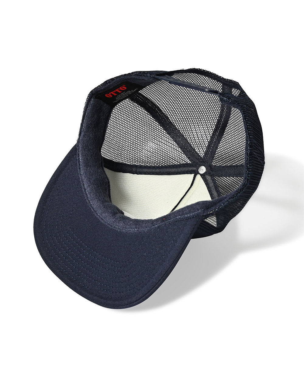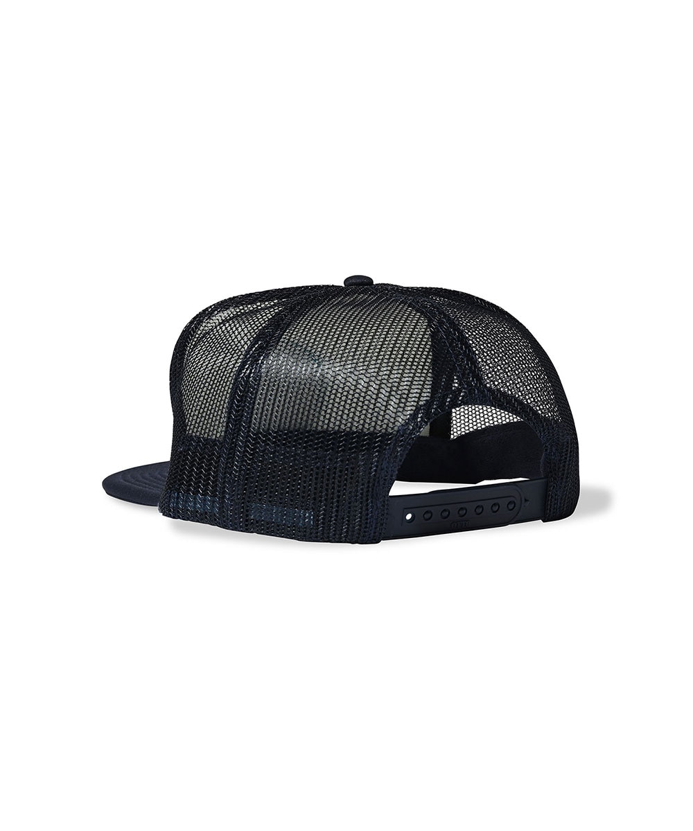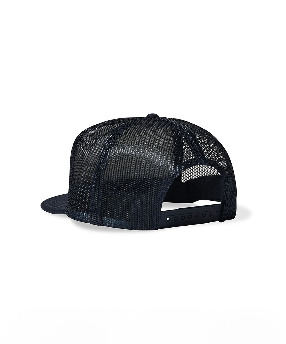 背面は通気性の高いメッシュ、スナップバック仕様でサイズ調整も自在。アウトドアからフェスシーンまで活躍するトラッカーキャップ。