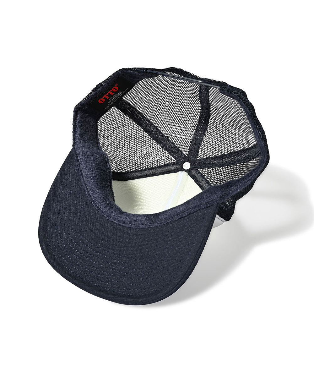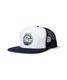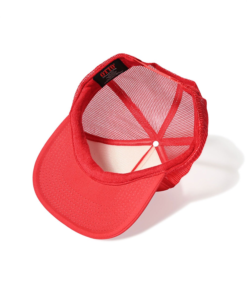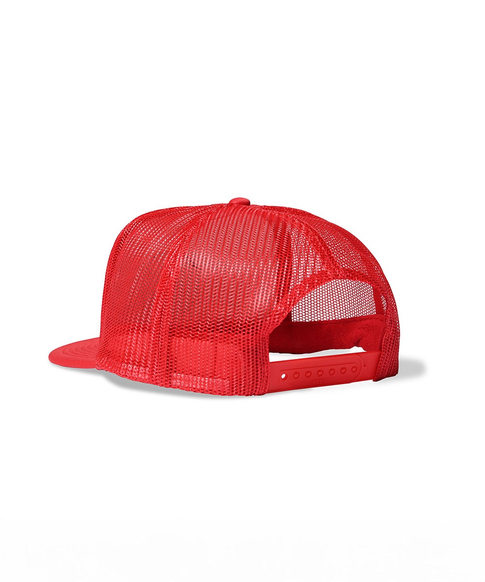 背面は通気性の高いメッシュ、スナップバック仕様でサイズ調整も自在。アウトドアからフェスシーンまで活躍するトラッカーキャップ。