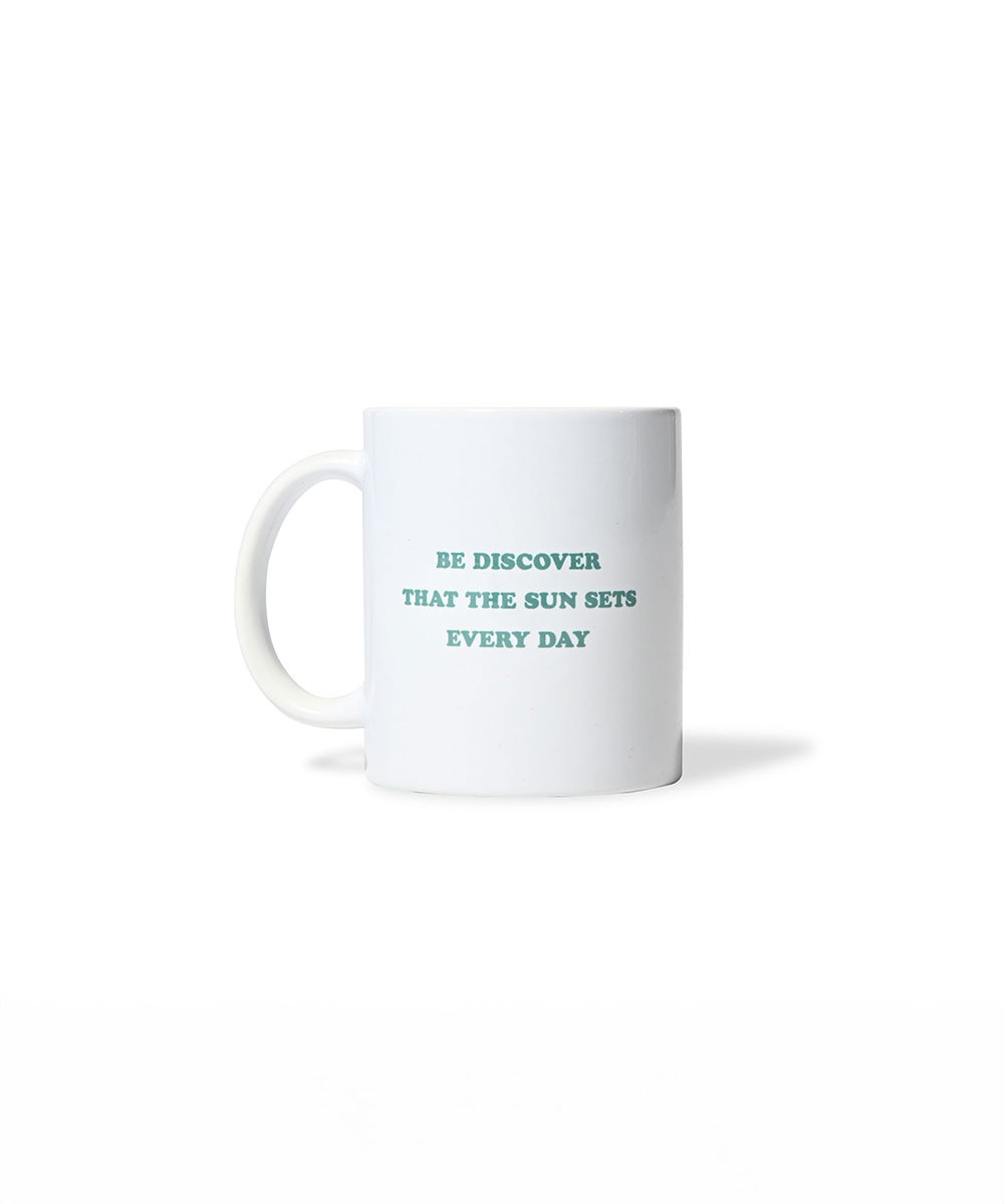 MARKESTAのクラシックロゴ「M」を中央に配し、背面には “BE DISCOVER THAT THE SUN SETS EVERY DAY” のメッセージをプリントしたオリジナルマグカップ。