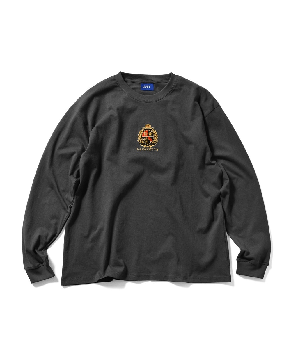 エンブレム調デザインを刺繍で表現したL/S TEE。