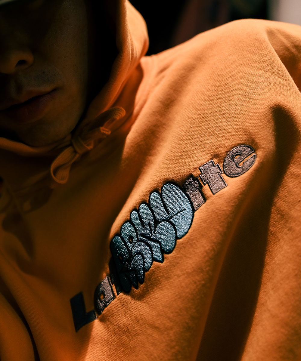 REMIOによる印象的なグラフィックをLafayetteコアロゴの上から被せるようにデザインした高密度な刺繍が特徴。