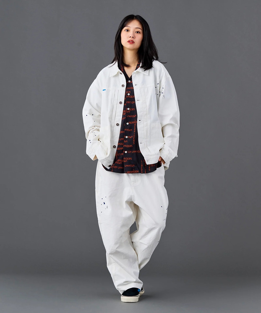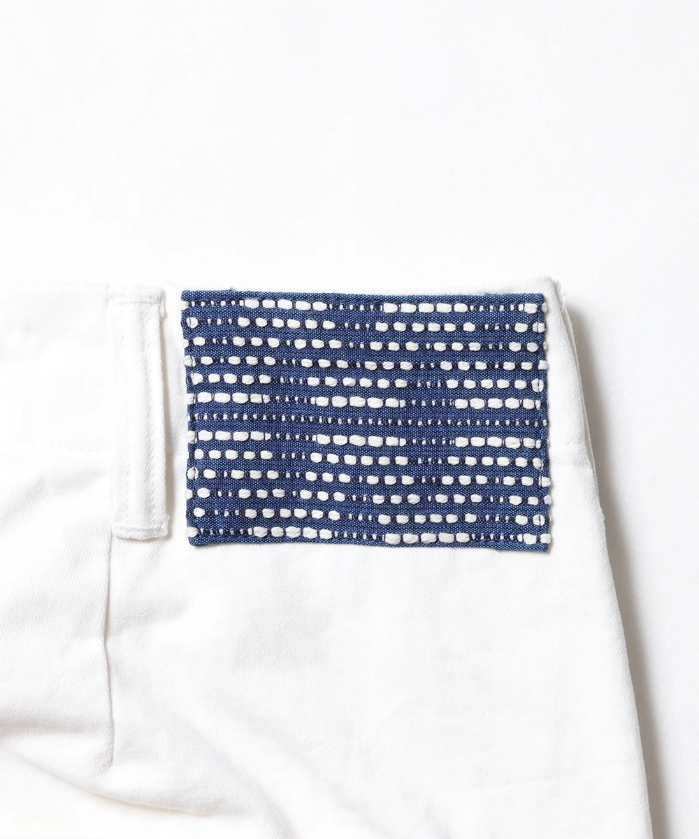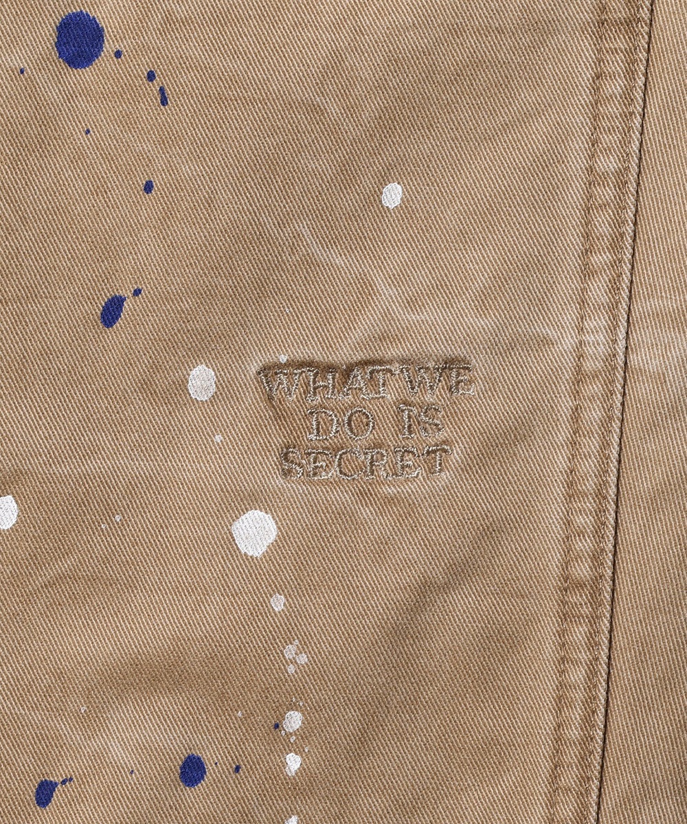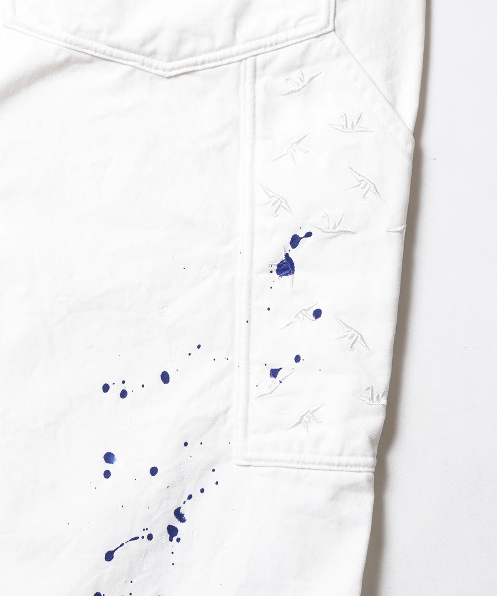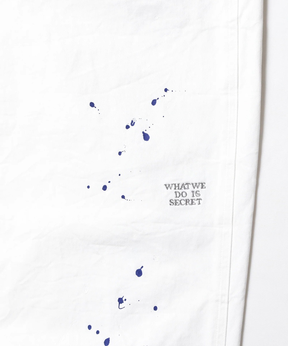 左腿にWHAT WE DO IS SECRETの同色刺繍が入ります。背面のスパナポケットには折り鶴同色刺繍が総柄で入ります。