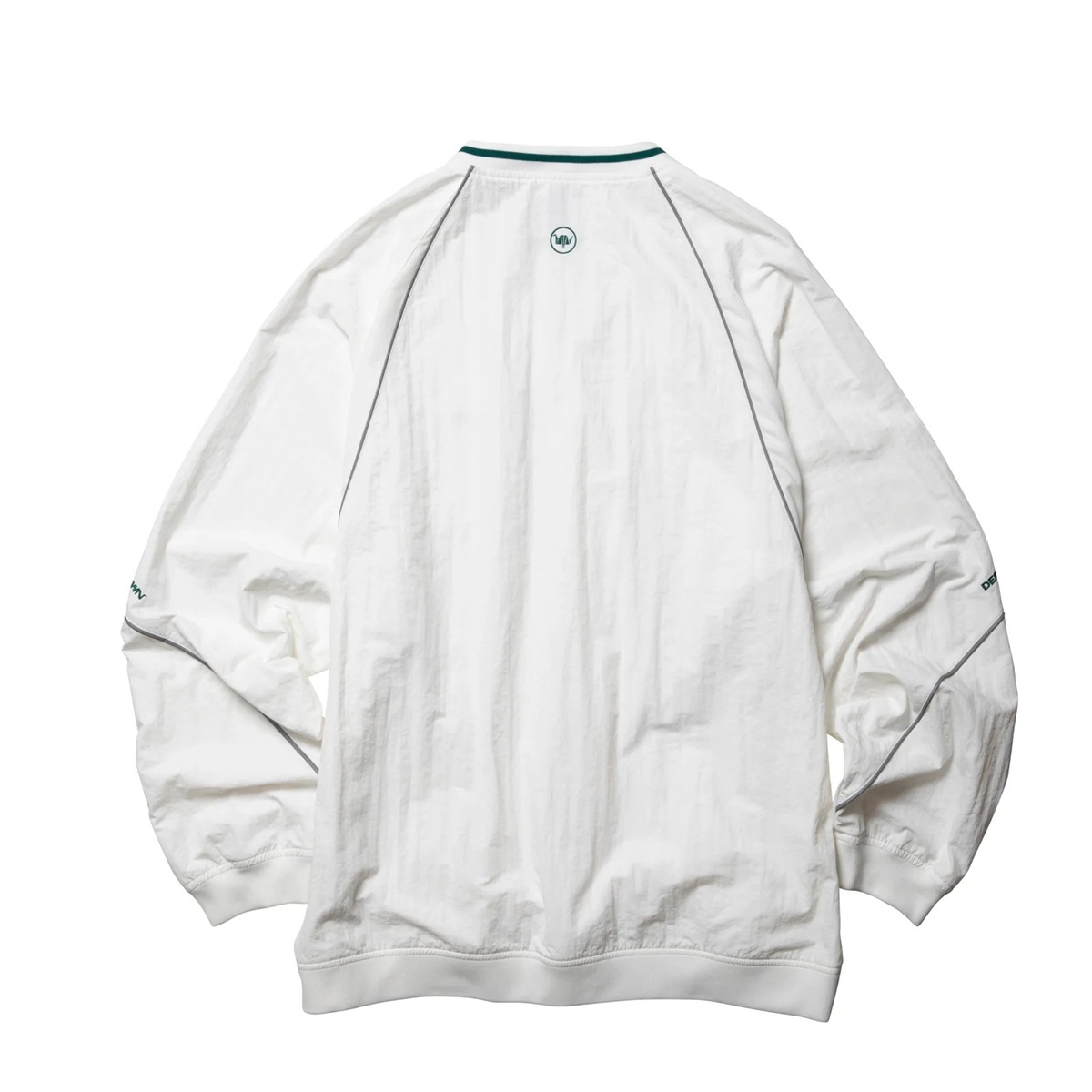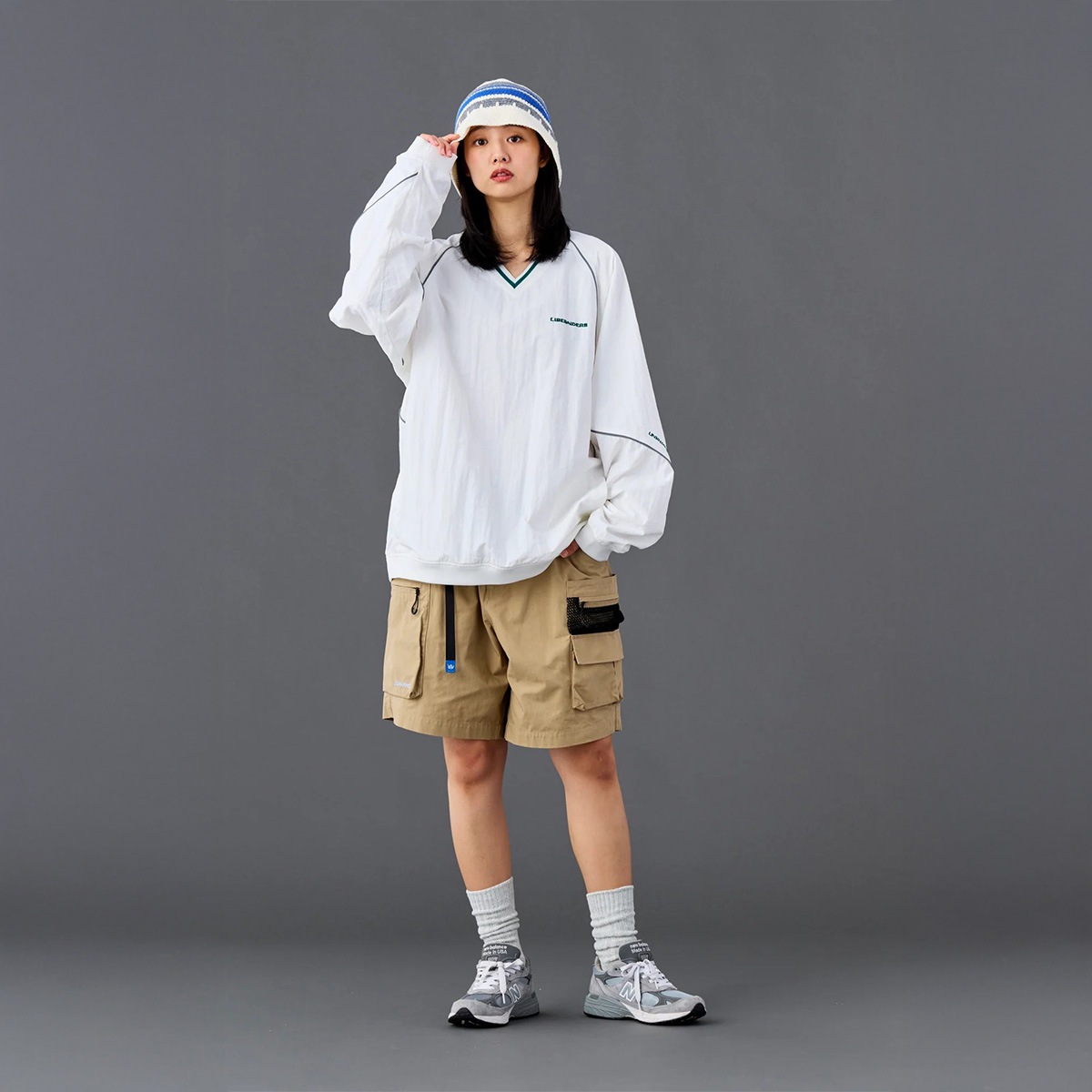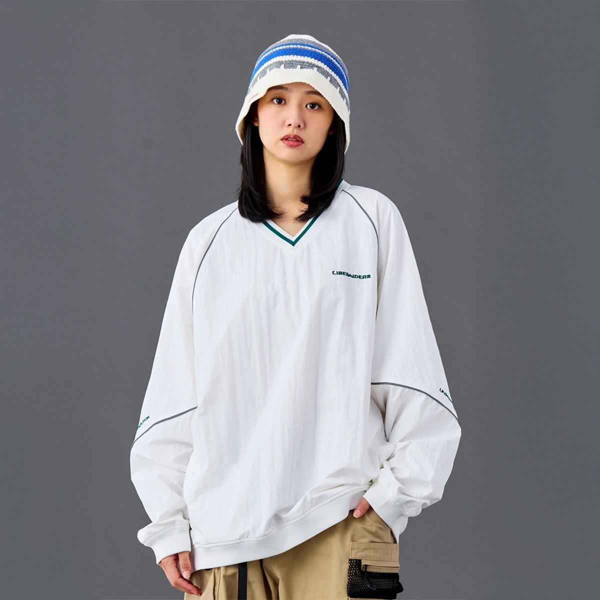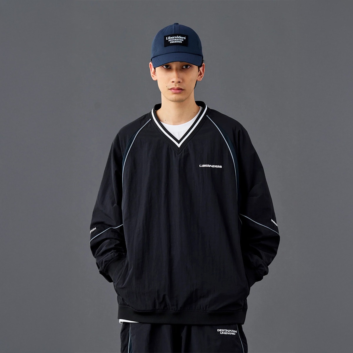 塩縮ナイロン生地を使用したVネックプルオーバー。