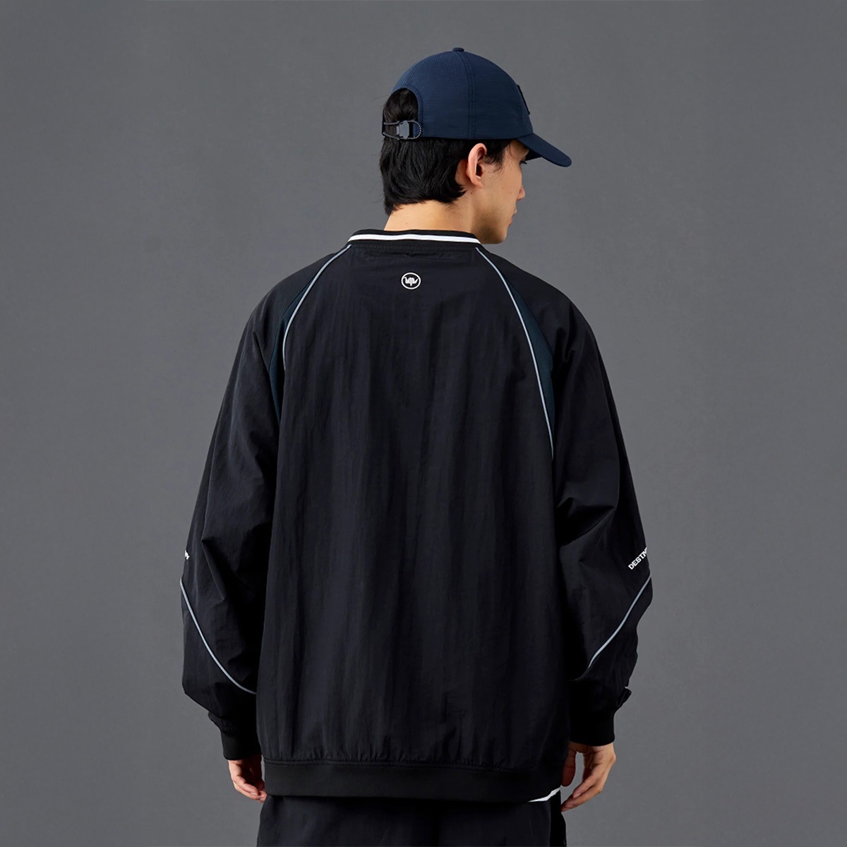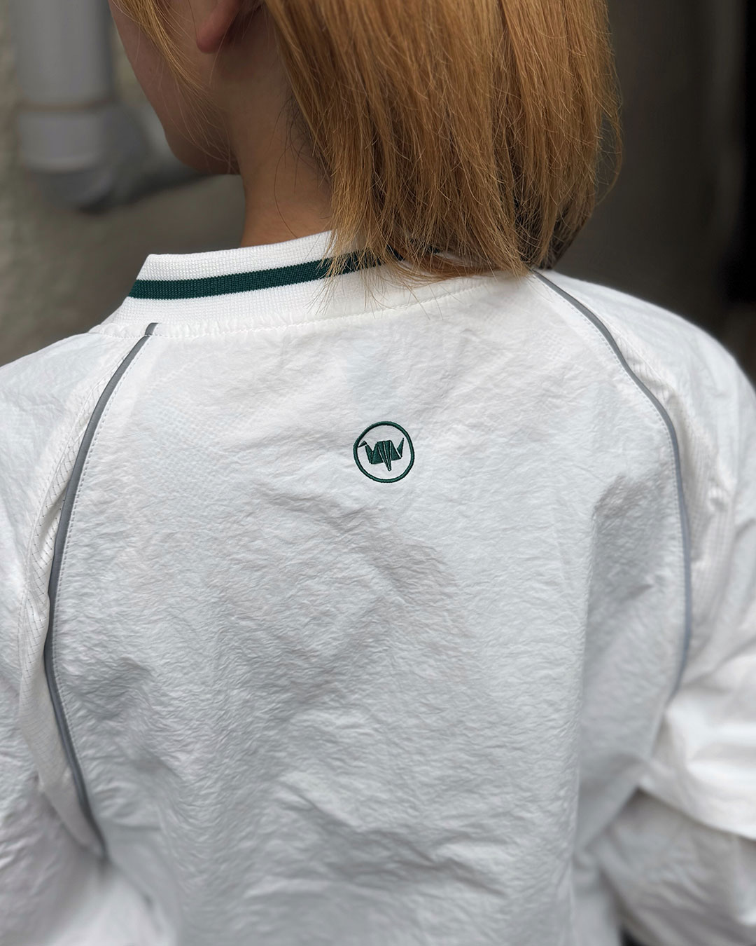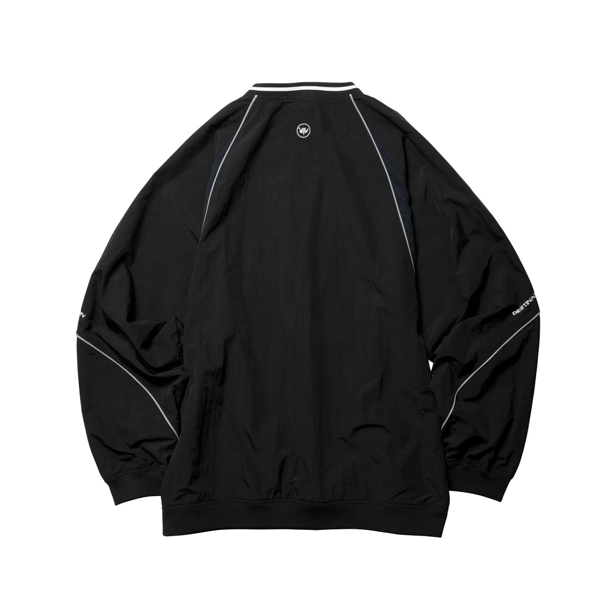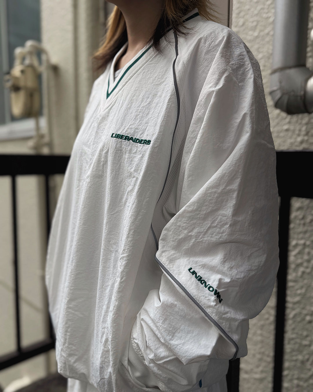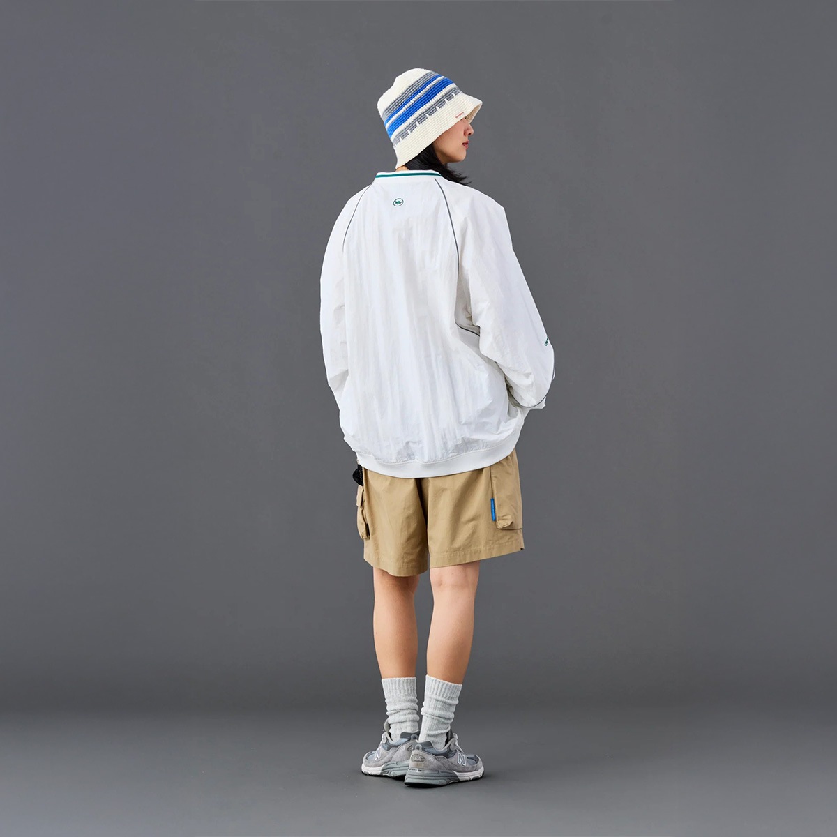 塩縮ナイロン生地を使用したVネックプルオーバー。