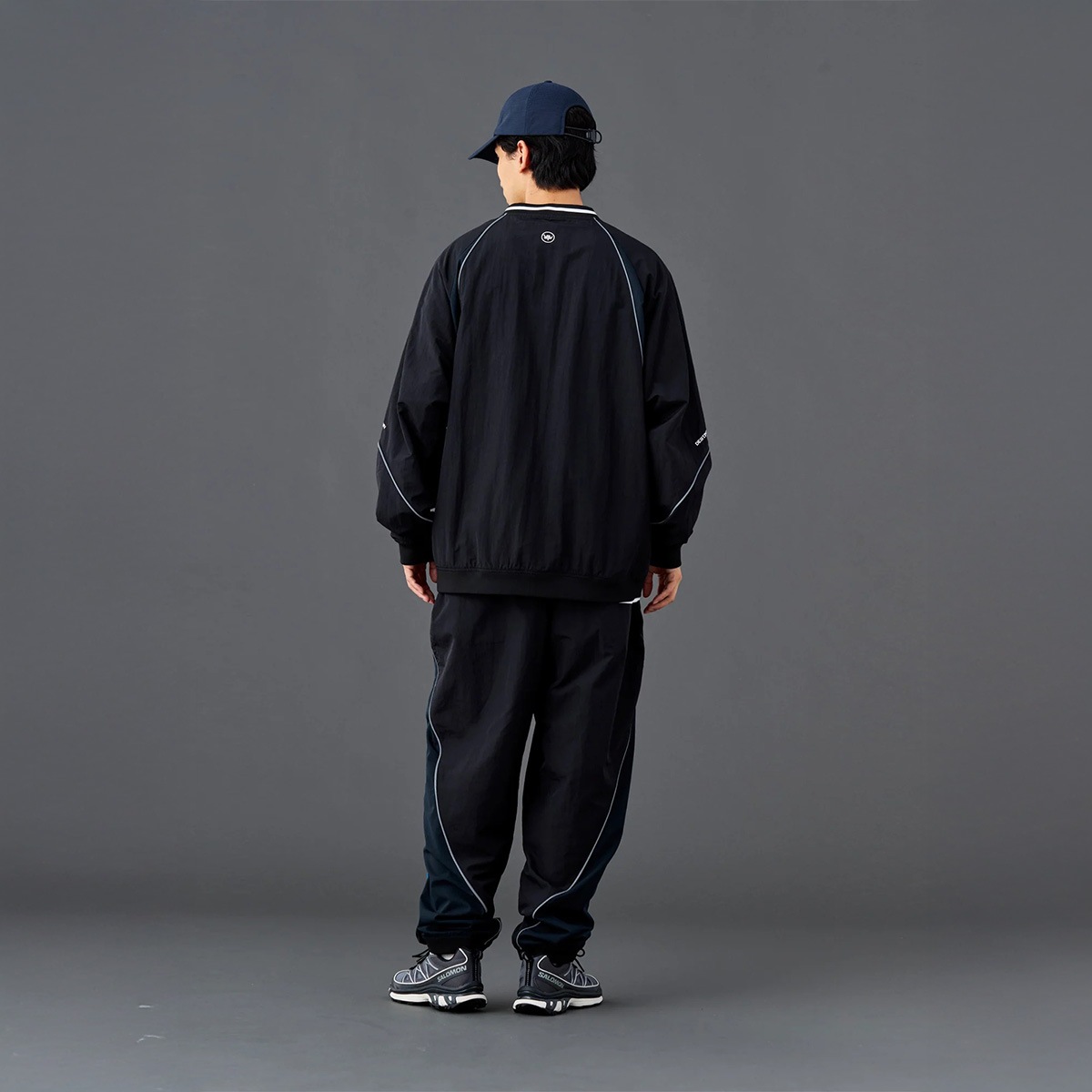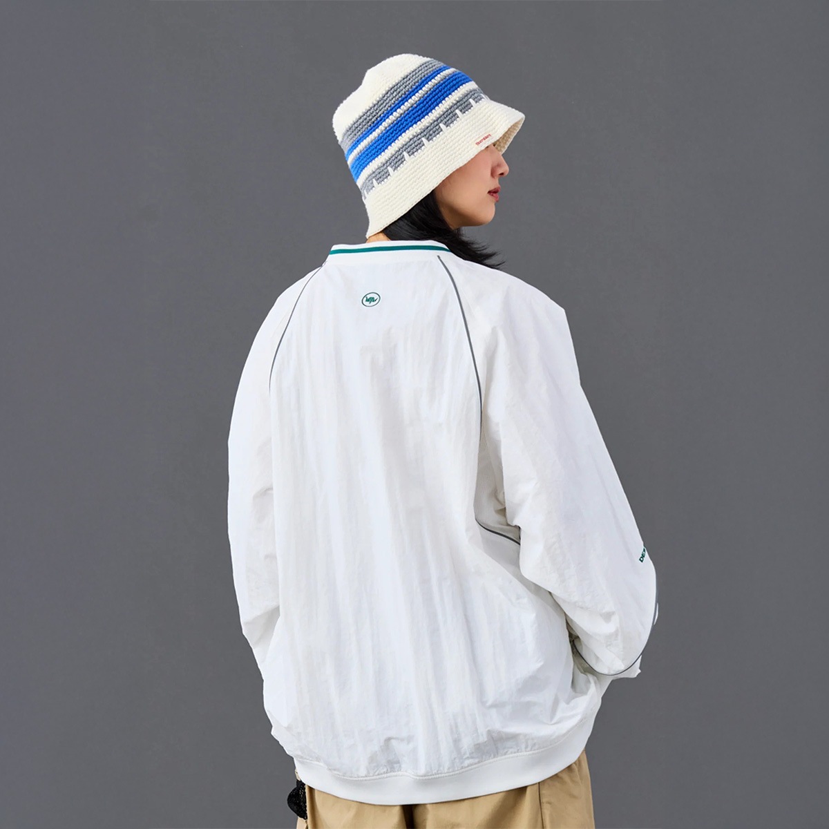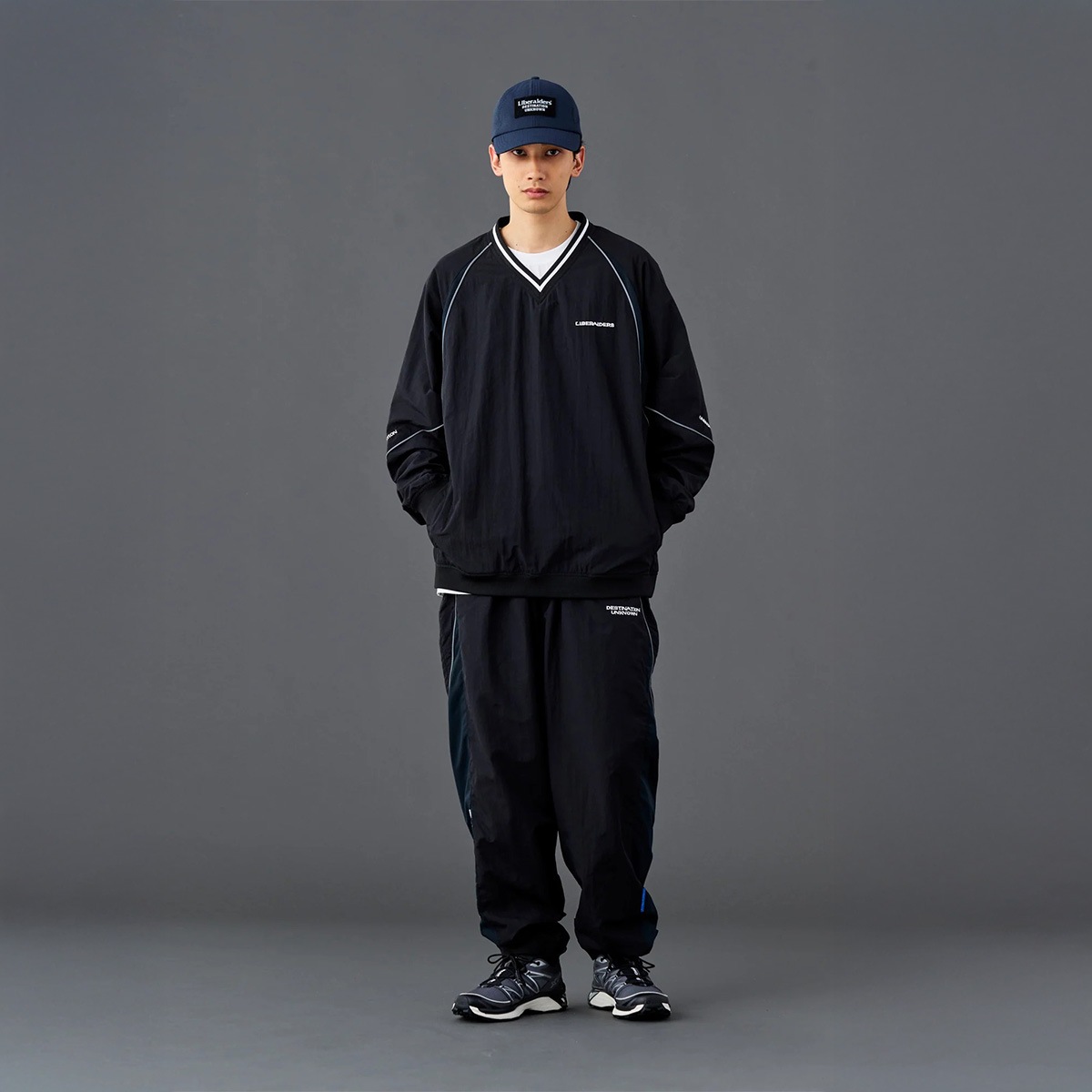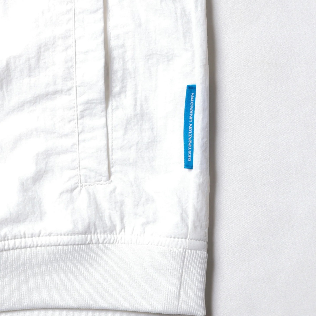 塩縮ナイロン生地を使用したVネックプルオーバー。