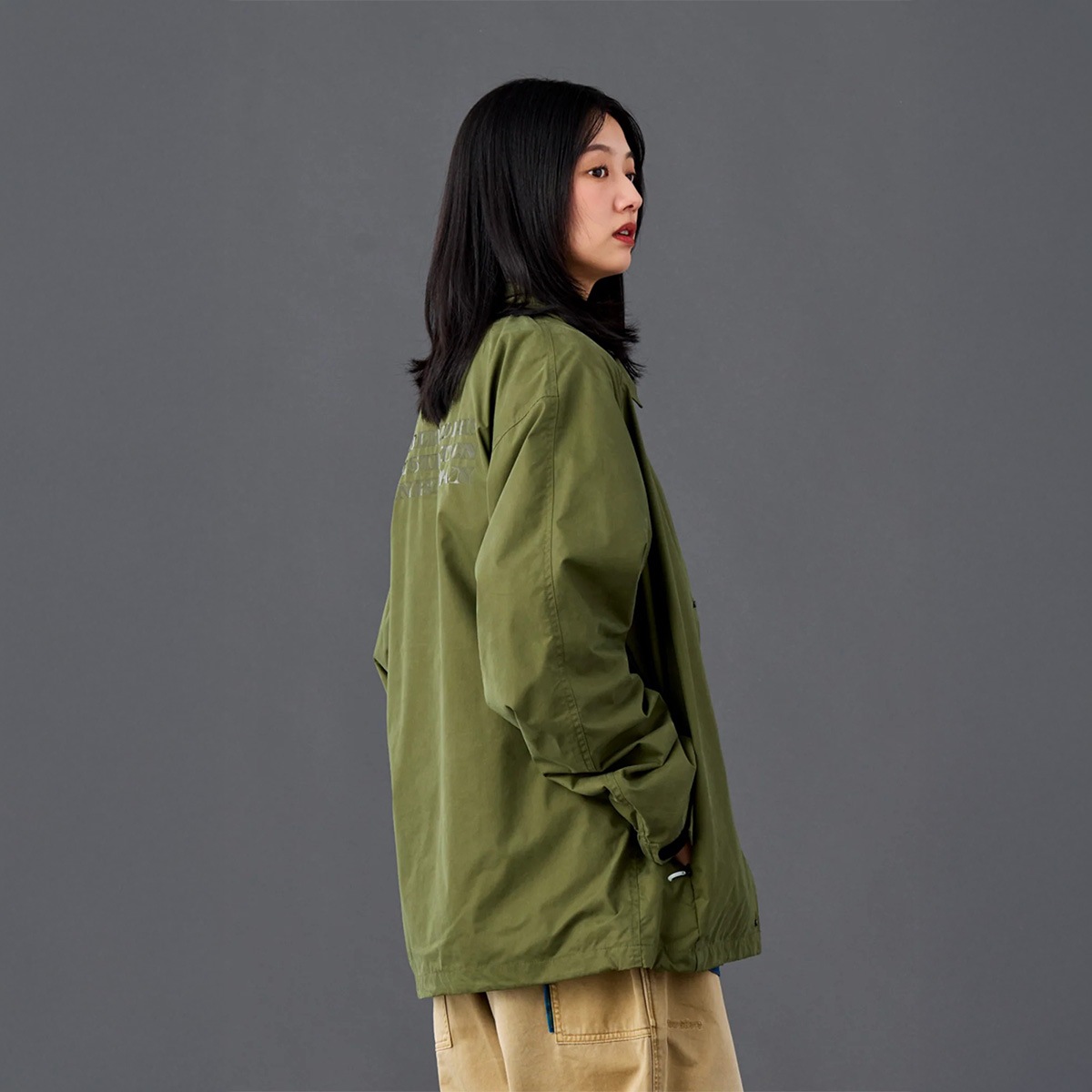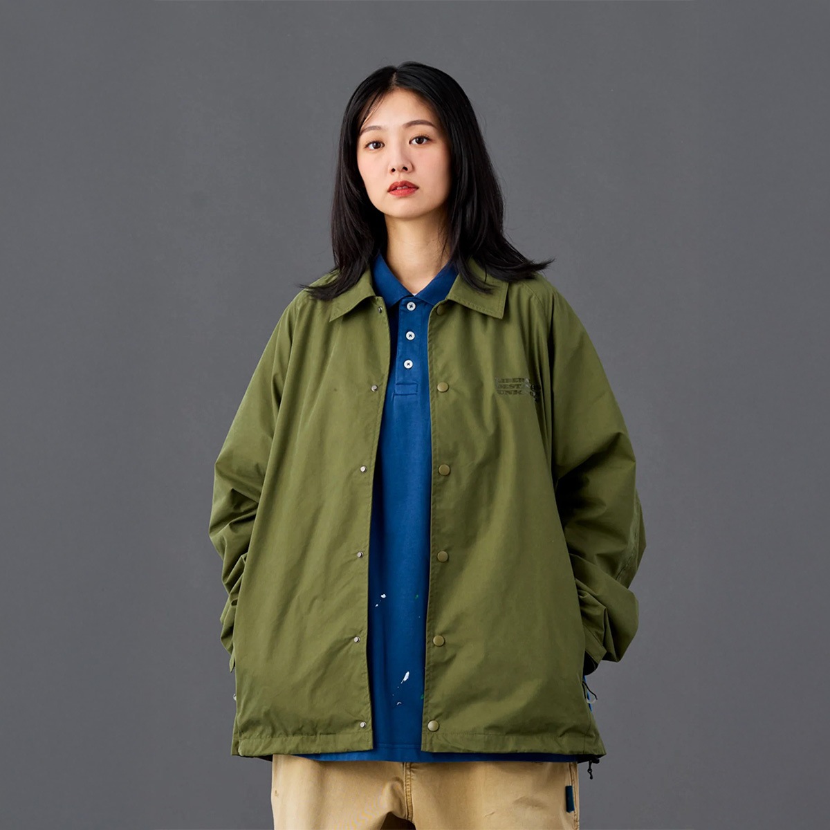 ピーチスキン生地を使用した機能的なコーチジャケット。