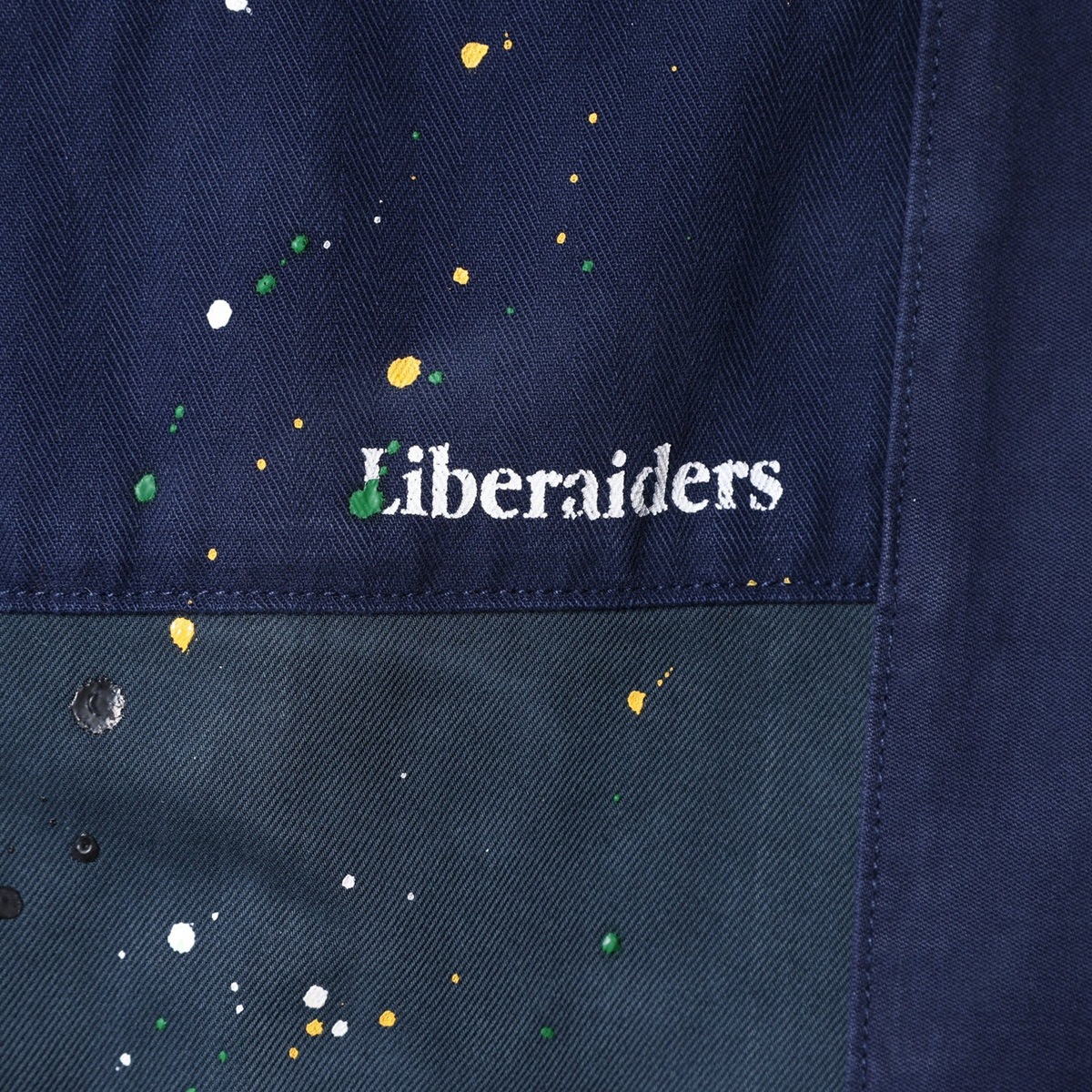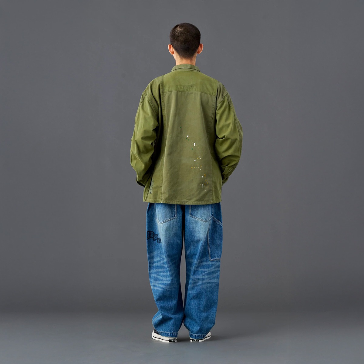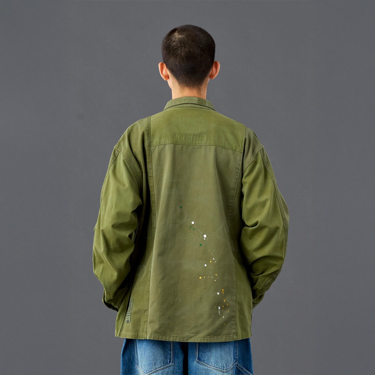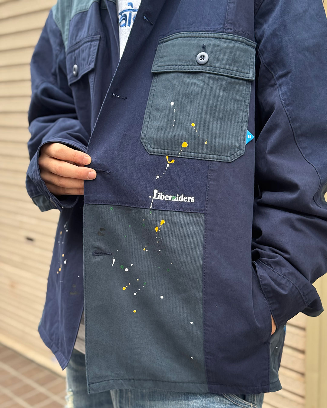 縫製後にビンテージ加工、ペンキ飛ばし加工を入れています。
