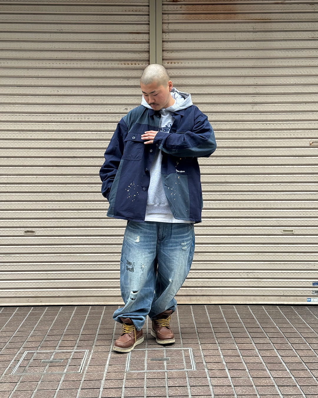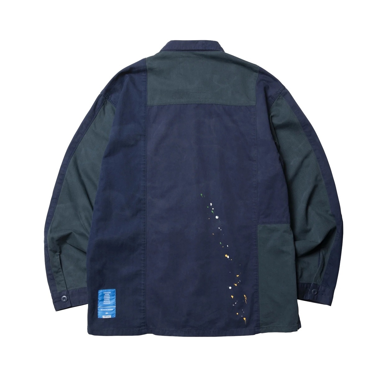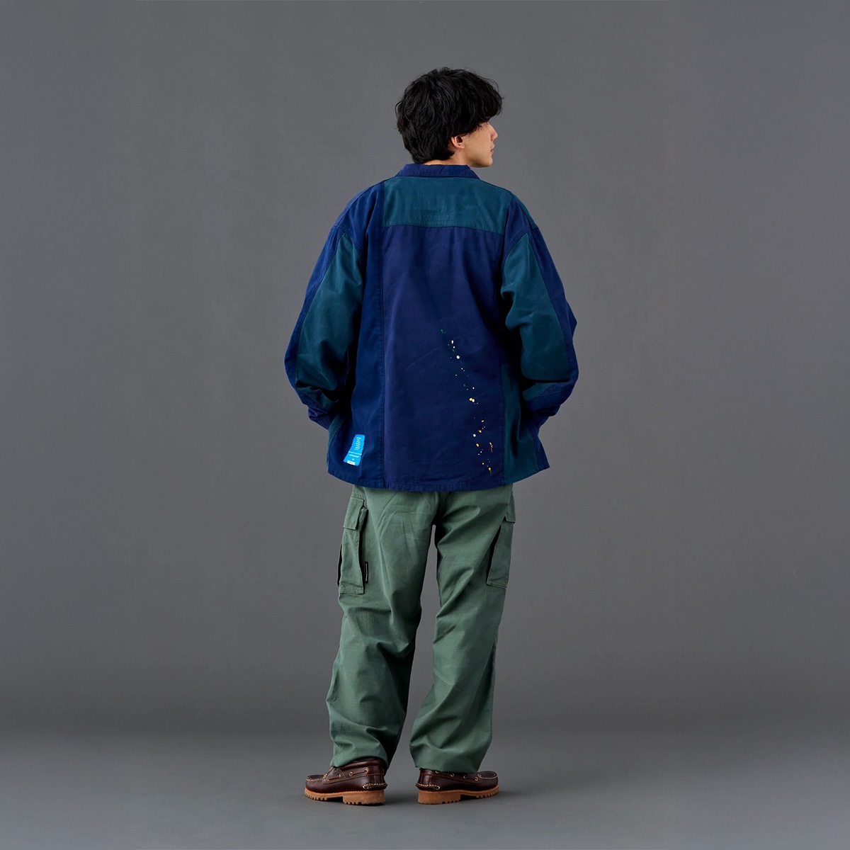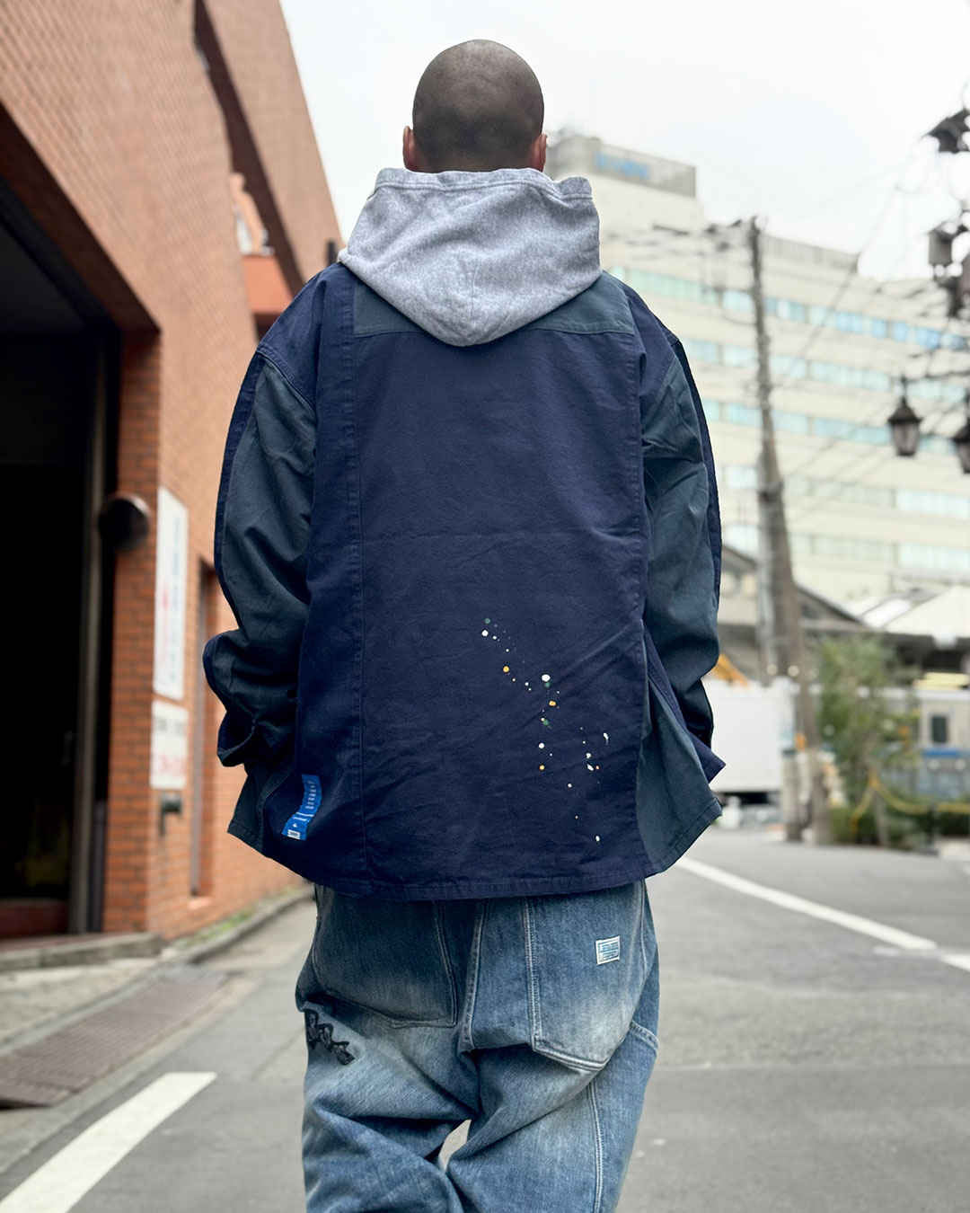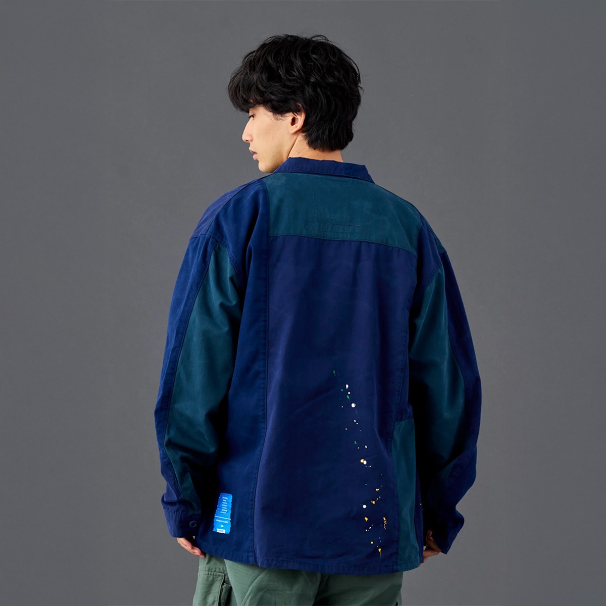 縫製後にビンテージ加工、ペンキ飛ばし加工を入れています。
