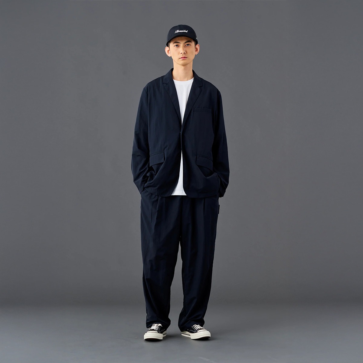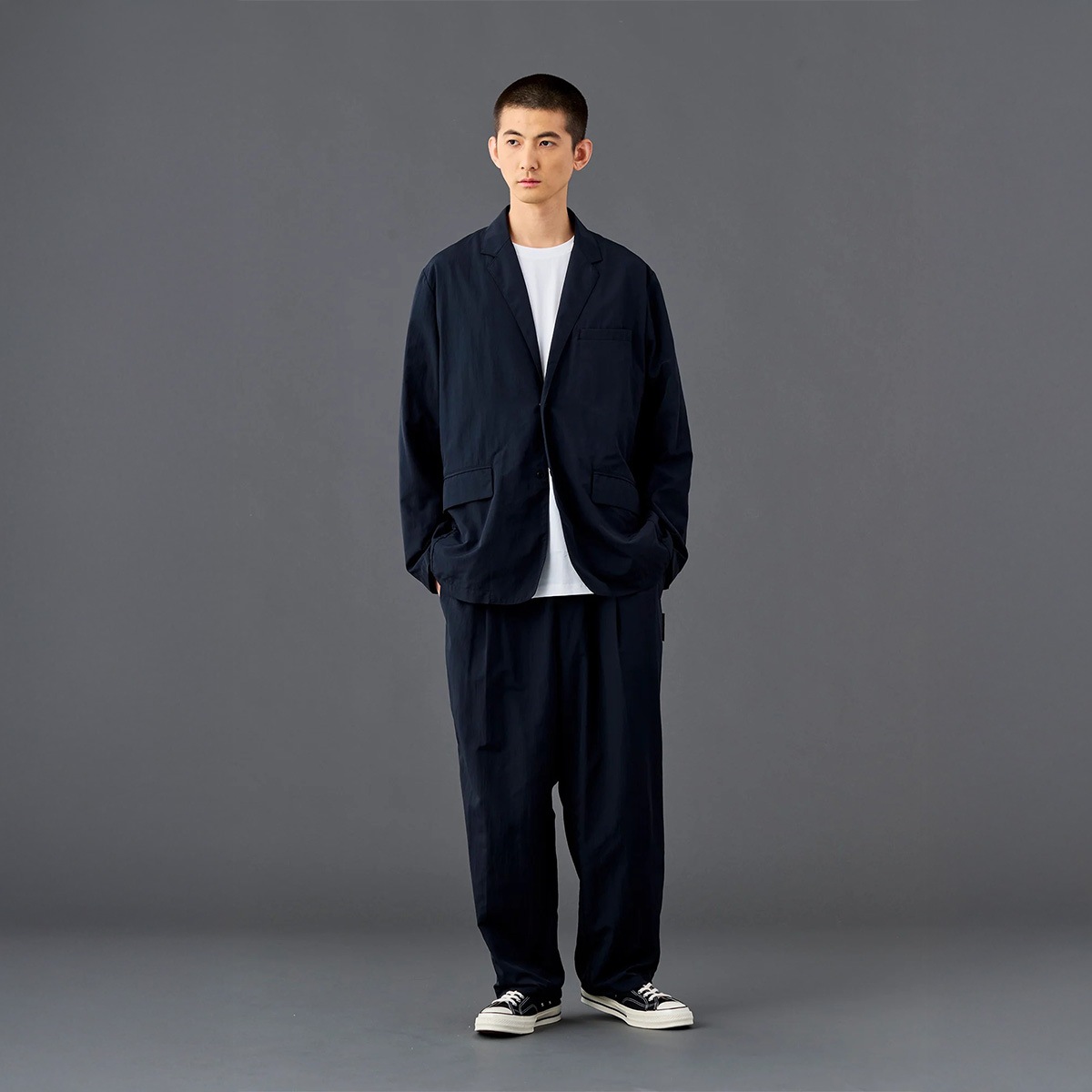 同素材のジャケットとセットアップで着用できる一着。
