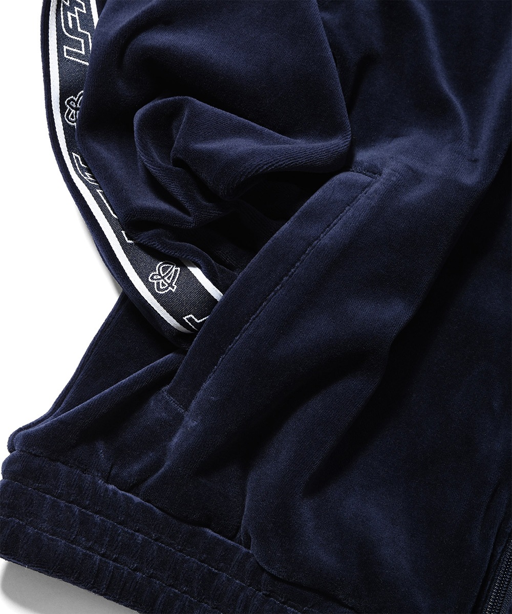 高級感あふれる見た目と保温性が高いベロア素材を使用したトラックジャケット。