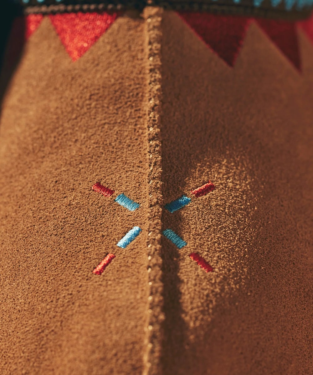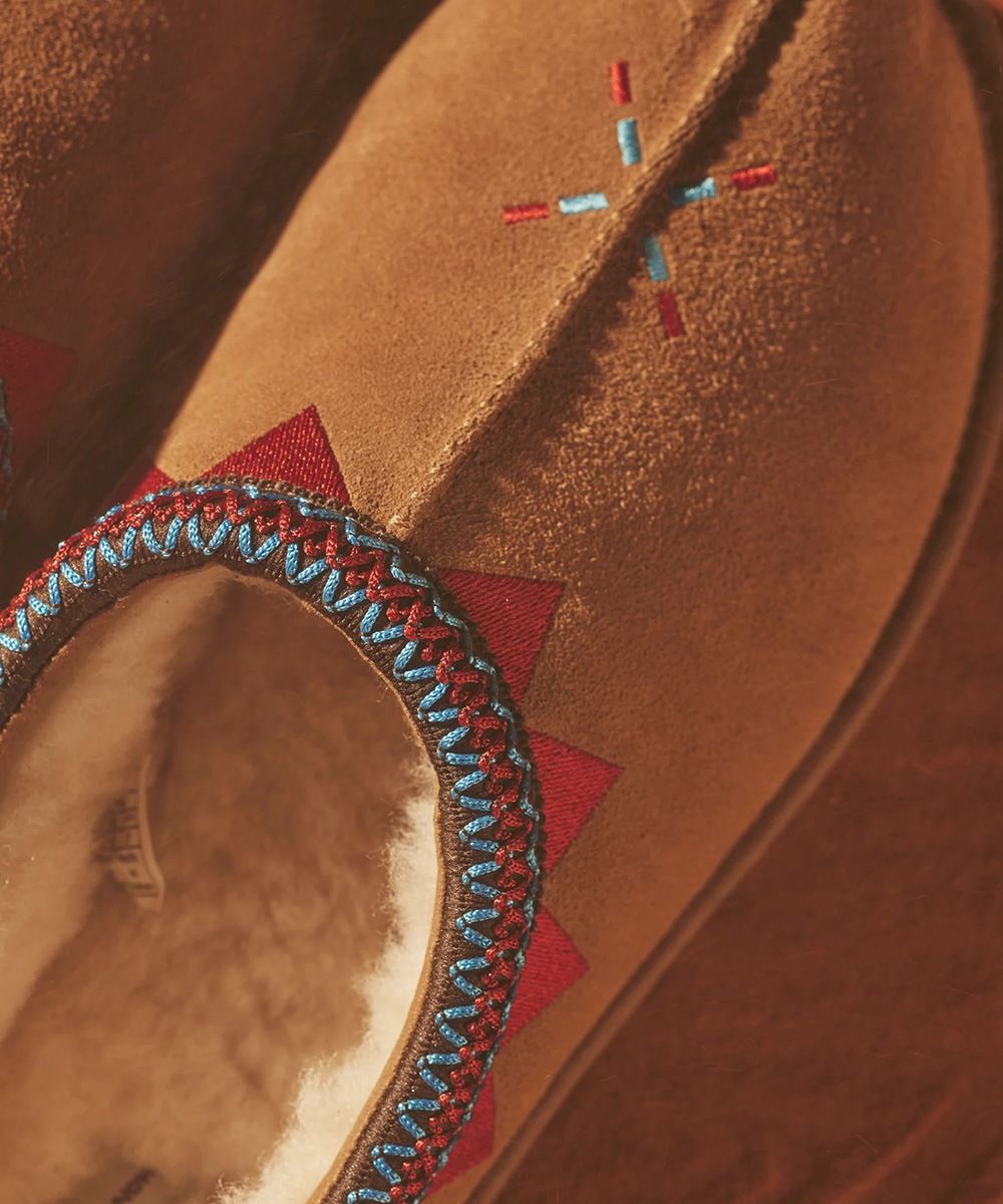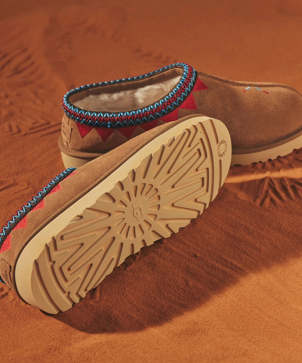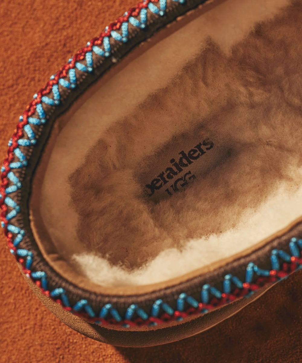外でも履けるスリッパとして長年親しまれているUGG?の代表的なモデルTasman(タスマン)をベースに世界中を旅しながらコレクションを発表しているLiberaidersが民族的考察に関して再構築した一足。